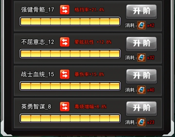 能量技能解析:对敌方直线造成高比例伤害高概率燃烧燃烧伤害比较高,还有一个提高前排的格挡率,两回合这个是可以叠加,也最高也就40%,用处不是很大,但是自身被动的话需要高格挡来触发格挡回去,所以修炼上面的话格挡这些要搞一搞。但是这个角色机制比较牢,现在很容易被一些高爆发的角色慢慢磨掉。所以玩这个角色还是要谨慎一点