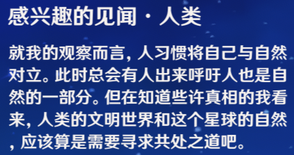 通过他的话可以看出来,他并不排斥人类,并认为未来提瓦特中,星球的自然(龙族)与人类文明世界,其实是可以和平共处的。