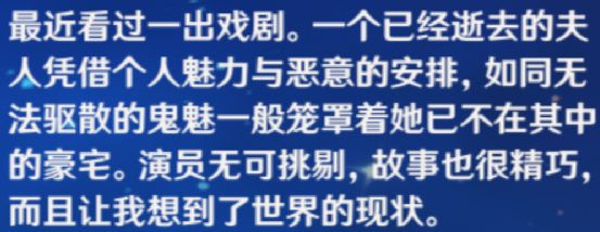 好家伙,这位夫人(天理维系者),凭借个人魅力(威慑力)与恶意的安排(七神制度),如同鬼魅般笼罩着她已不在其中的豪宅(维系者正在死去)。