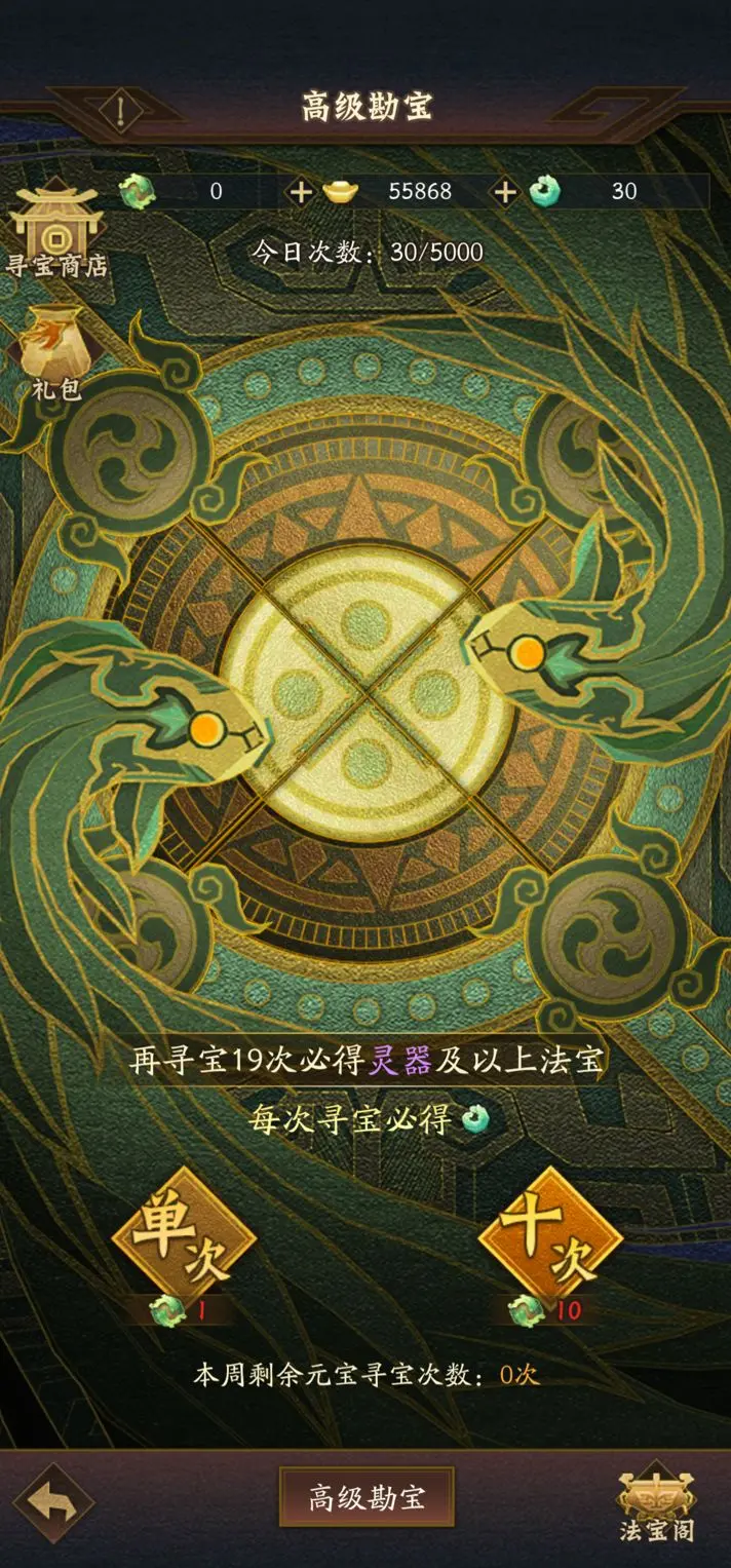 消耗寻宝仪可以在高级勘宝中进行勘宝。累计寻宝30次后必得灵器及以上法宝!