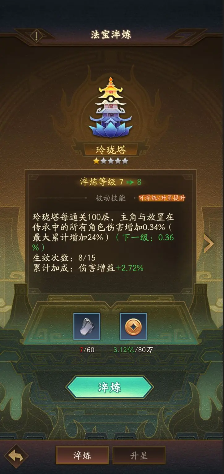 法宝可以使用百年玄铁和铜钱对法宝进行淬炼,淬炼升级后可提升法宝被动技能加成属性。