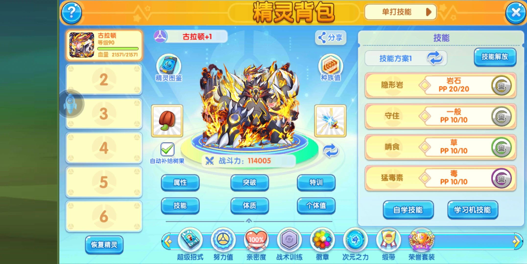基本配置通常4变化,啃食和剑舞则是看需要,原始回归技能则是原始啃咬、原始岩崩、原始太阳、原始地裂;携带物团结或者腰带。古拉顿环境作用还是很大的,主要是原始啃咬主打的还是一手留人,抓的范畴为特防z。物防z古拉顿基本打不动,但是可以强化,强化+4可杀,当然也要看对方黑雾在哪一个位置,如果在死亡形态上,回归打在死亡形态不用强化也可以杀。四变化的携带守住相当重要,主防就是一手密勒顿。猛毒则是因为可以做预判很多精灵基本上是不带奇迹果的了。