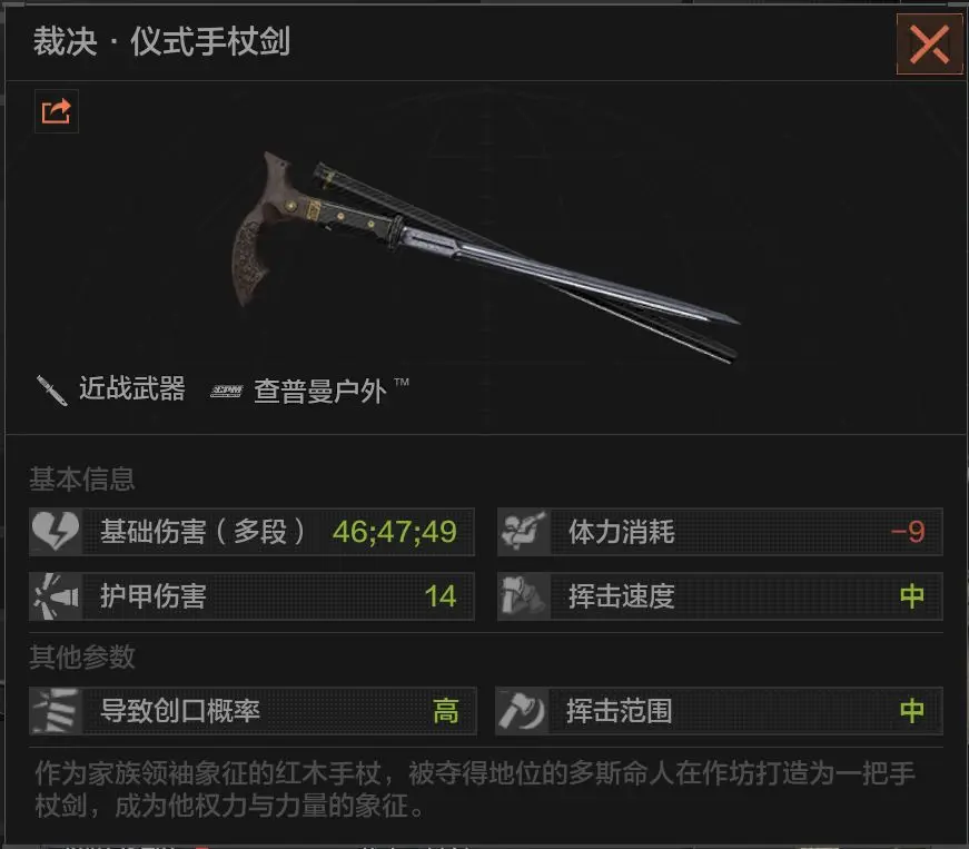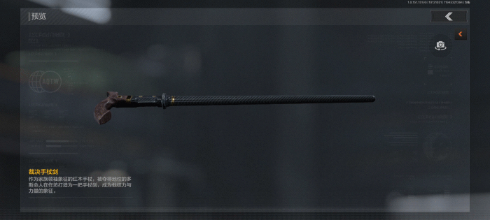 查普曼户外出品的这款手杖剑是暗区首个自带剑鞘的近战武器。考究的红木雕花杖柄与螺纹刀鞘将其伪装成一把古朴的手杖,利用内藏的***刃即可出其不意的发动奇袭。