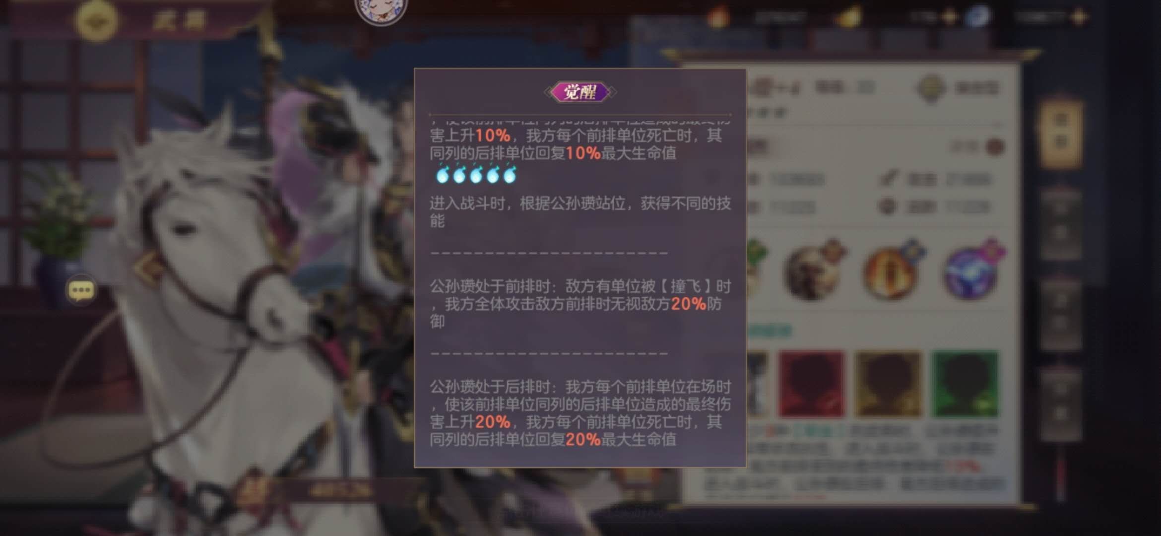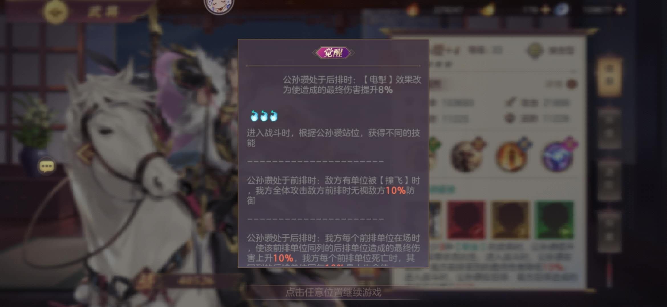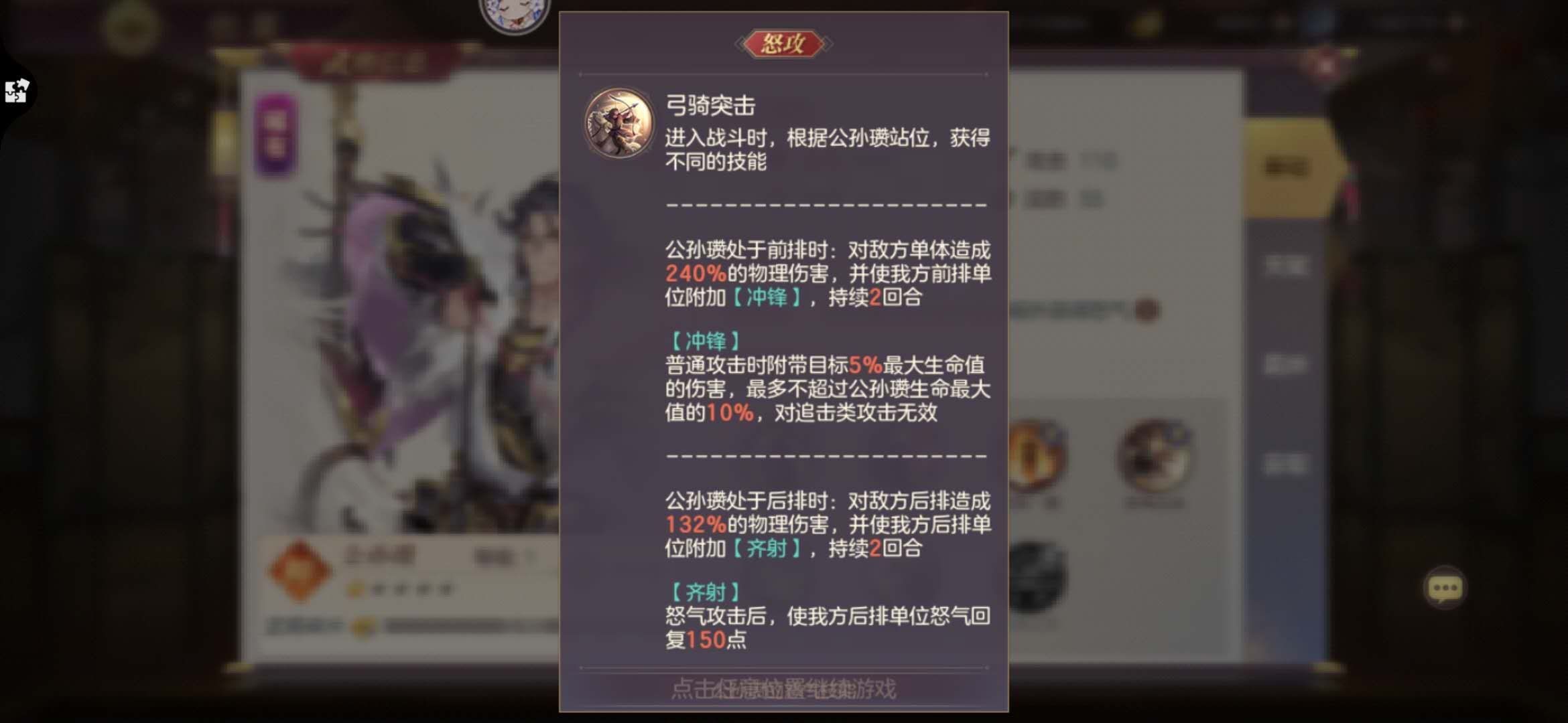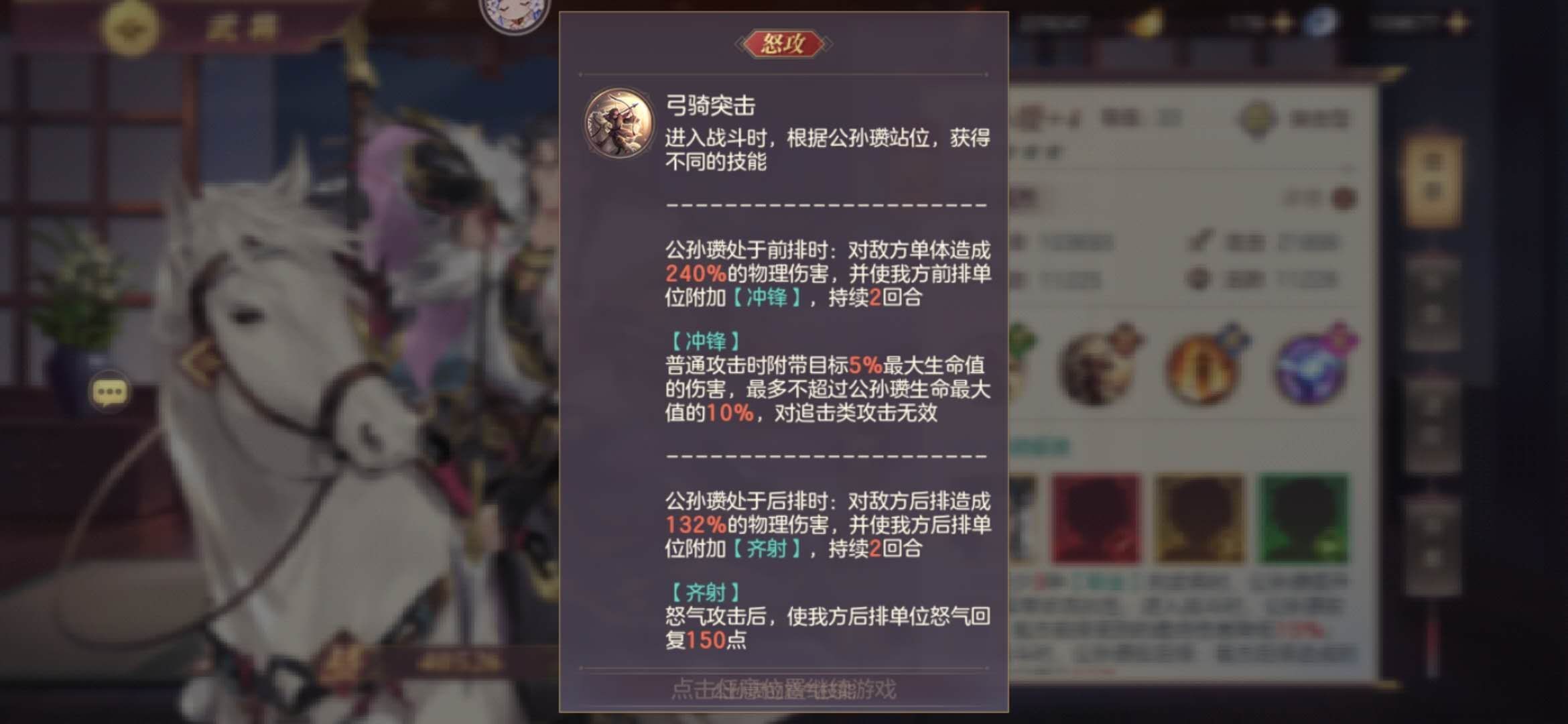 ①切后光环,当公孙瓒处于后排时,将会为我方后排添加【齐射】状态,当拥有【齐射】buff的武将怒攻时,将会为我方后排单体回复150怒气,如果配合上像荀彧之类可以辅助回怒的武将,那么,三个【齐射】buff都将有机会被触发,能够后排每个武将回复450的怒气值。