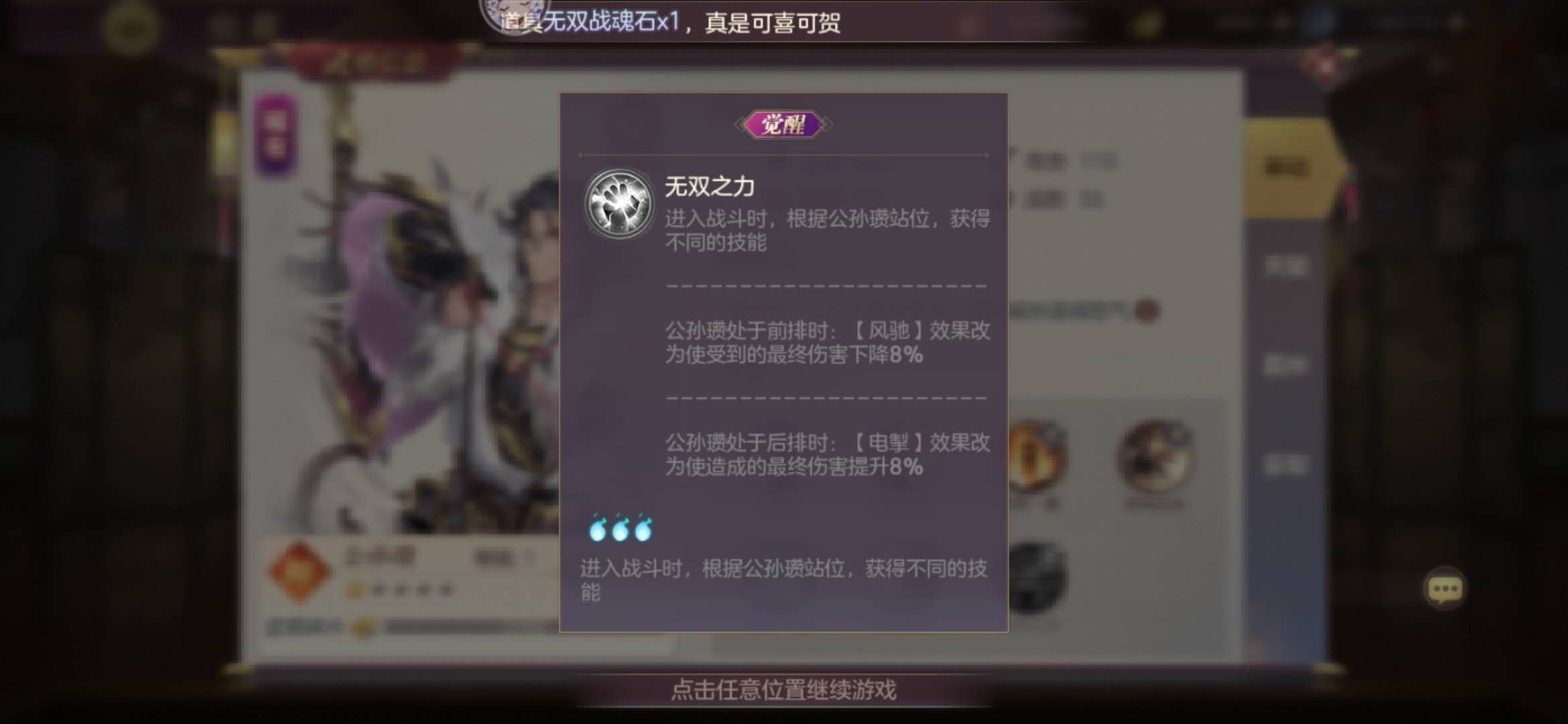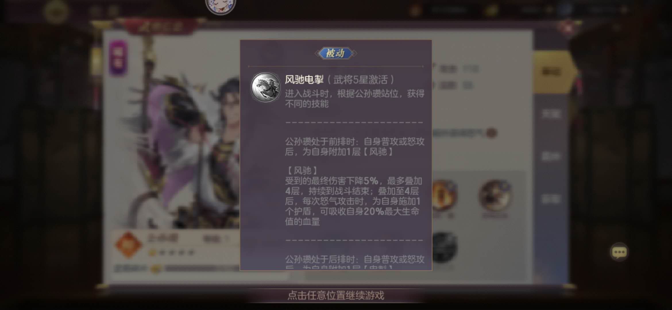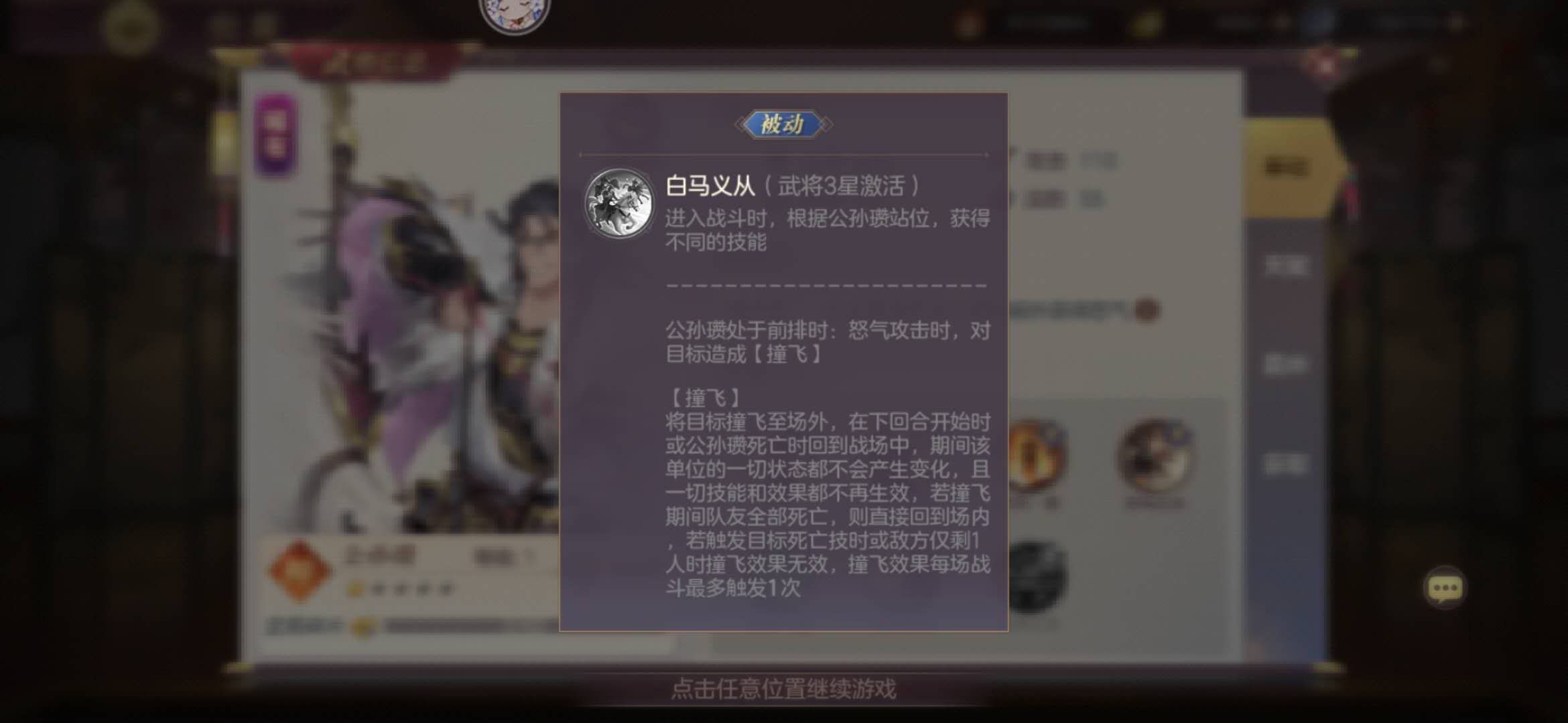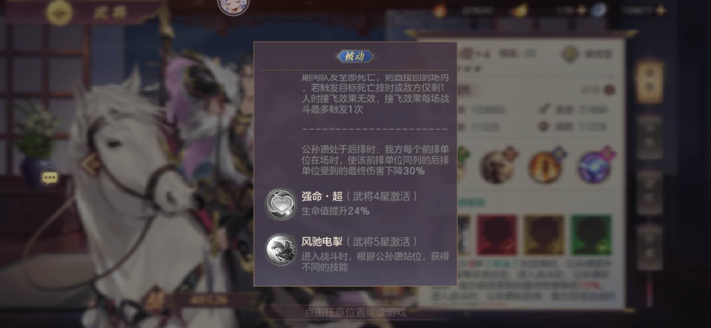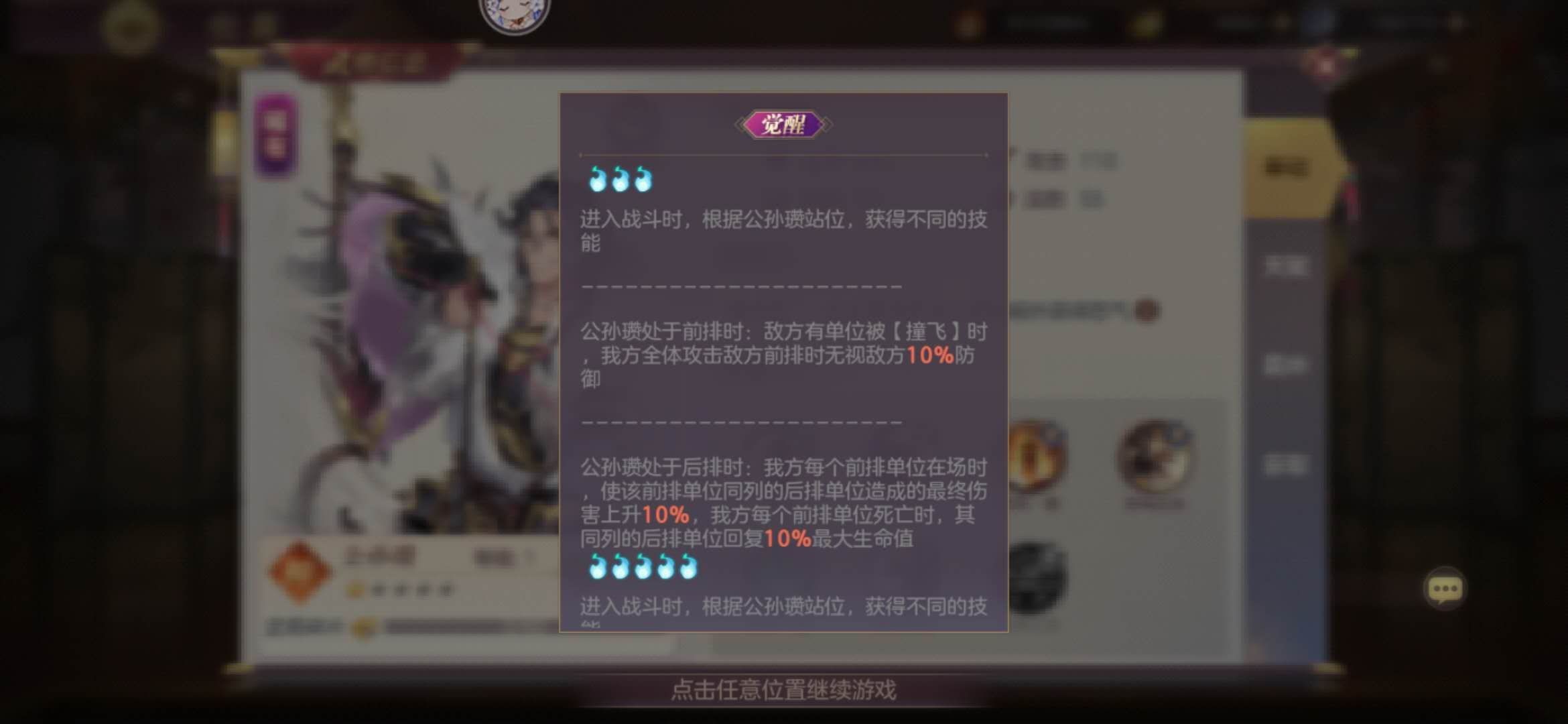 ①切后光环,当公孙瓒处于后排时,将会为我方后排添加【齐射】状态,当拥有【齐射】buff的武将怒攻时,将会为我方后排单体回复150怒气,如果配合上像荀彧之类可以辅助回怒的武将,那么,三个【齐射】buff都将有机会被触发,能够后排每个武将回复450的怒气值。