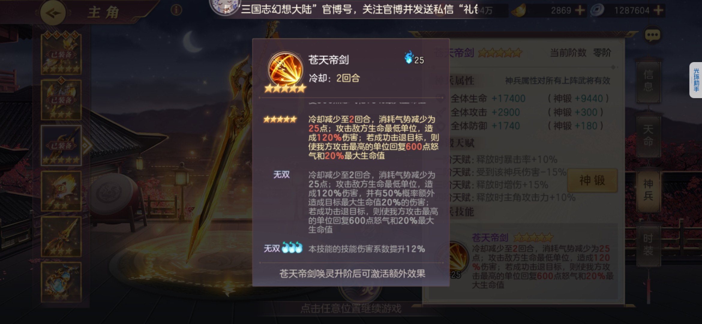 在前面的文章里,也是给大家分析了弟弟剑和吸怒扇的优劣和选择,而在最新的更新中,也是迎来了神兵系统的大升级,每一件神兵都得到了符合自己特色的提升,神兵也是做到了全民无双(第三套时装预定),下面就给大家分析一下陪伴大家最久的蓝色神兵苍天帝剑,在新版本的环境中到底如何,能否完成逆袭呢?