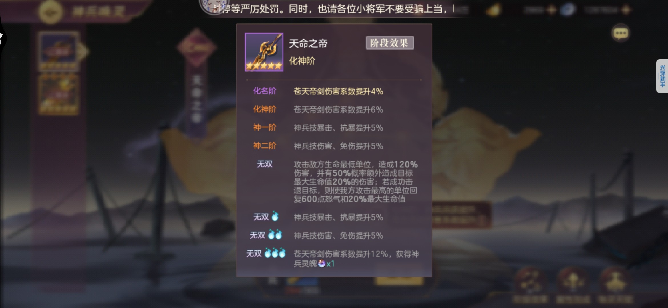 这里我们要注意的是,这也是神兵第一次出现神兵抗暴属性,之前是没有的,也就是说暴击率多少能打出多少,而现在引入了,或多或少会影响一点实战。