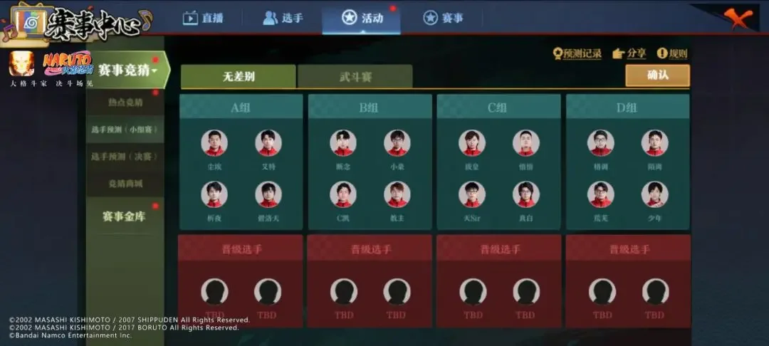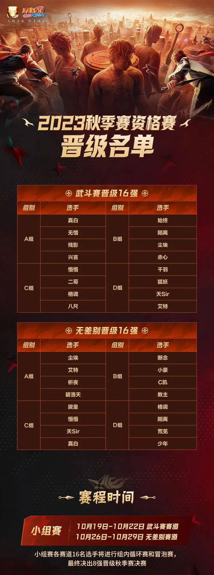 小组赛抽签结果《火影忍者》手游秋季赛双赛道资格赛已经告一段落,激烈的小组赛即将在10月19日开赛!学员们看看下面这份分组名单,有没有你支持的选手呢?