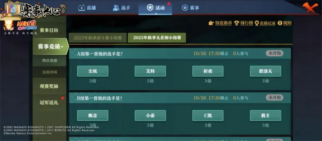 秋季赛决赛阶段即将开启《火影忍者》手游秋季赛决赛阶段即将开赛!十月末的双赛道小组赛将确定晋级决赛的选手。10月19日-10月22日为武斗赛小组赛、10月26日-10月29日为无差别小组赛。秋季赛总决赛将于11月10日-11月12日开赛。学员们可以前往游戏内赛事中心观看精彩的比赛,届时还有福利多样的赛事活动等待学员们参与哦~