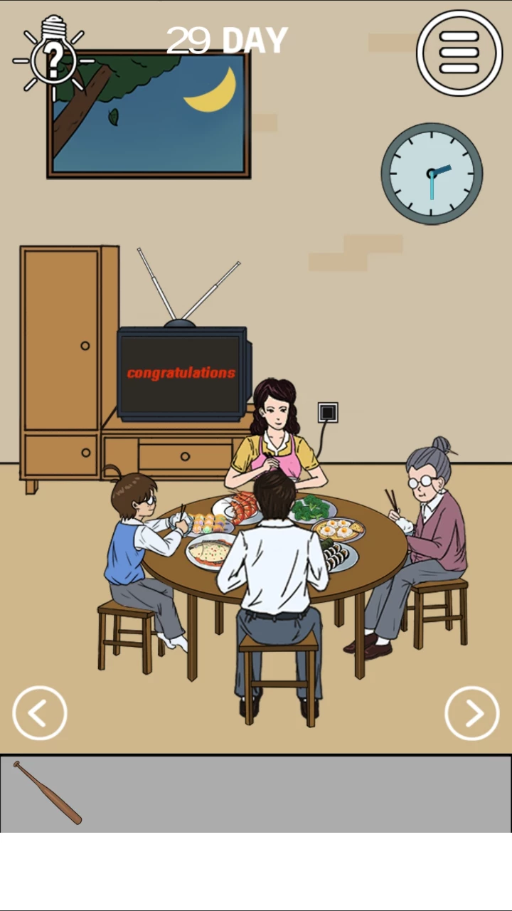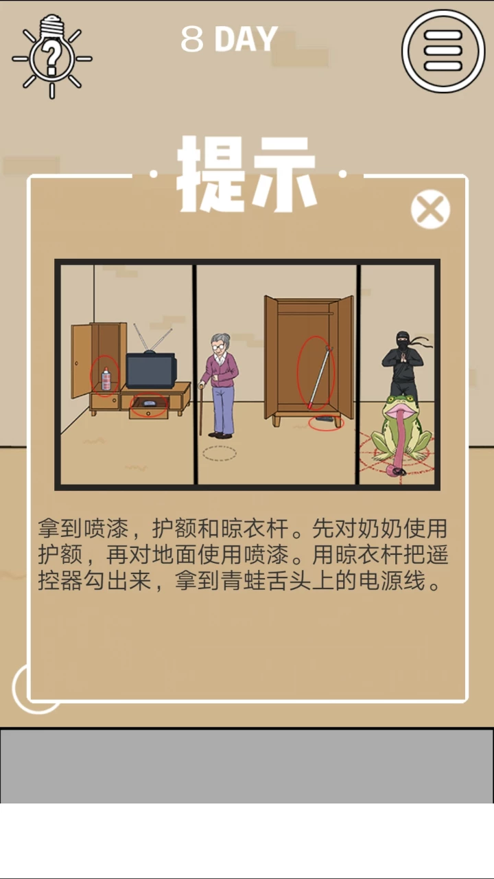 因此《妈妈不让我看电视》的关卡不多,但是内容十分丰富,脑洞也非常的大,十分值得一玩。看到这里,玩家是不是会担心自己没有办法找到通关的方式呢?但是无需担心,如果玩家实在没有解谜思路,可以点击游戏界面左上角的问号,可以选择通过看广告获得相关的提示或是直接获得答案。