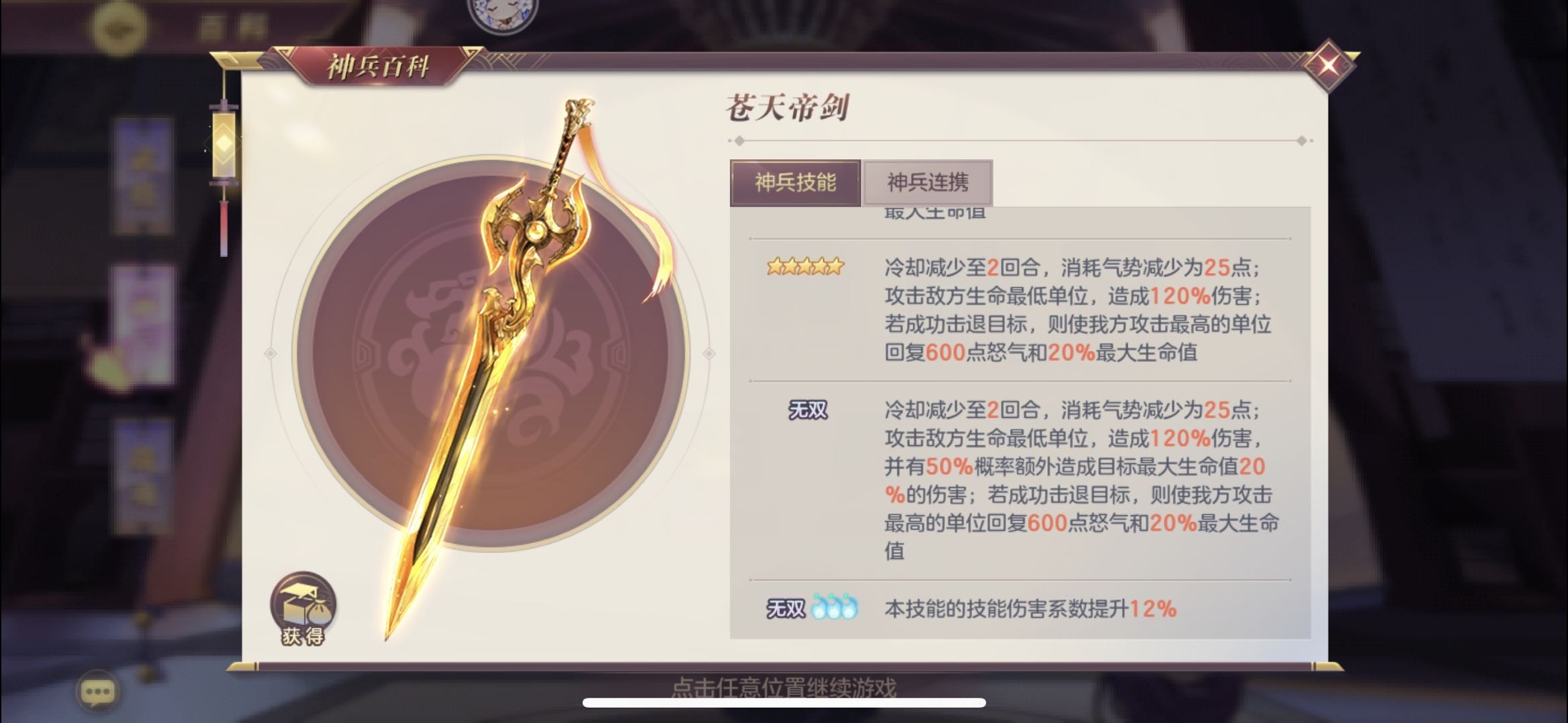 【帝剑】虽然是初始的蓝色神兵 但在原先版本依旧是非常强力并且有相当出场率的一个神兵 其特点用“斩杀”两字来描述 再贴切不过 无双之后 多出来了“50%概率的额外20%最大生命值”伤害 斩杀能力进一步提升