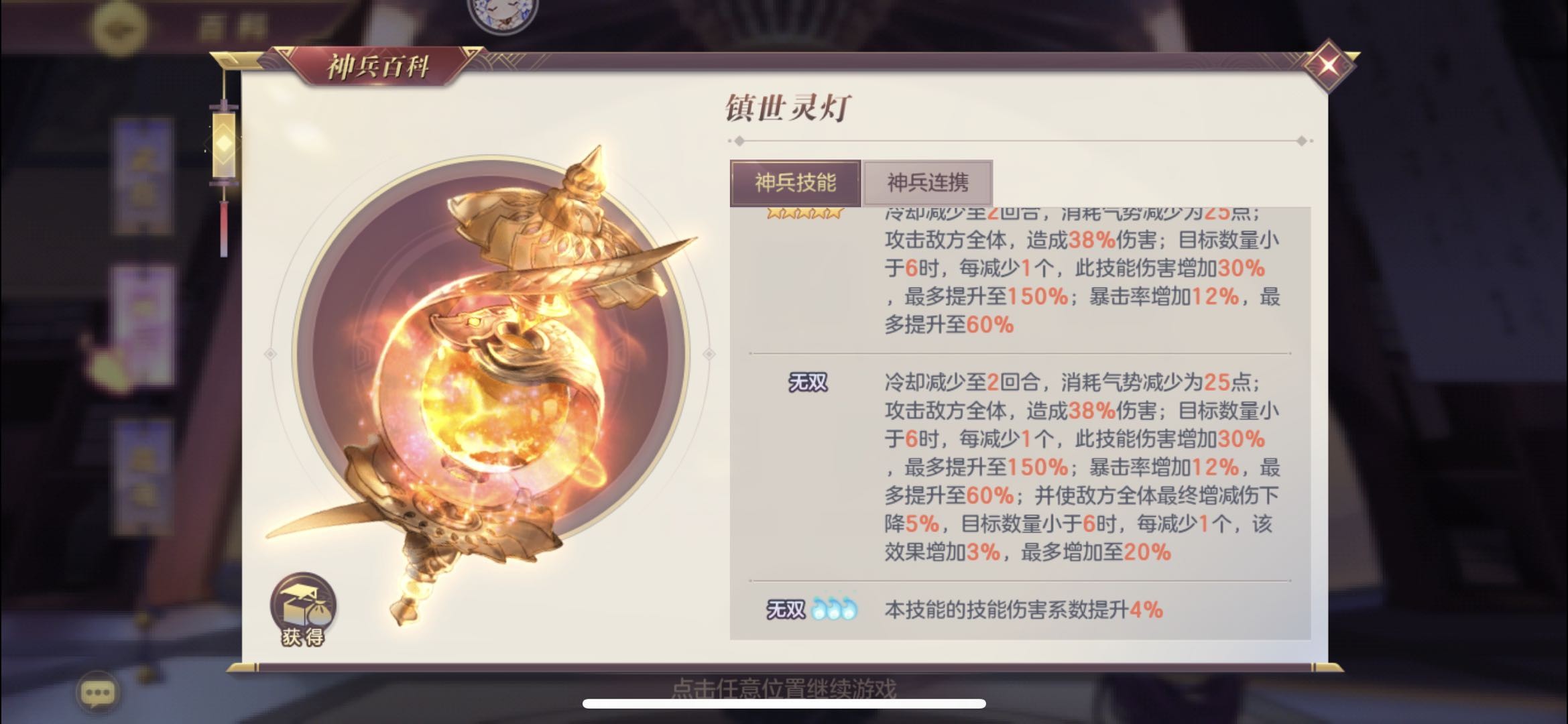 而无双策划改了一下思路 虽然特点依旧是人少效果强 但这次给灵灯补上了debuff 全体降低最终增伤减伤 我个人觉得往功能性方面发展的思路确实不错 但是效果还是略差了如果6人均在 一人只有5% 而即便当对方仅剩一人时 这个效果也只能提到25% 相比其他功能性神兵 完全没有竞争的余地