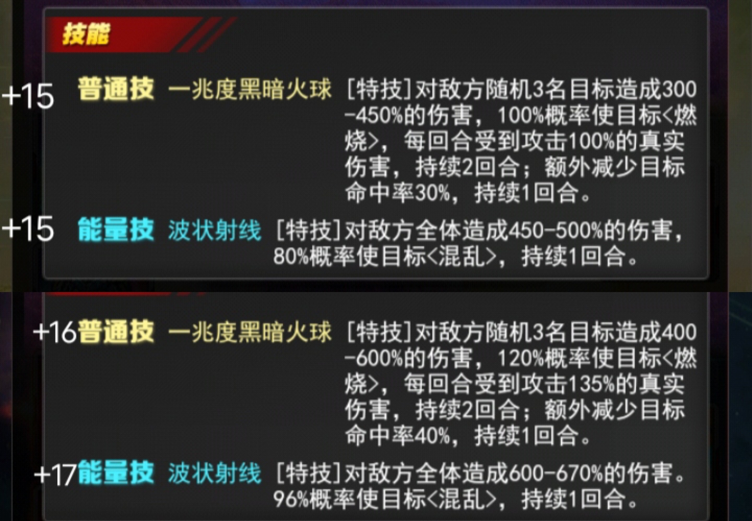 +17能量技 波状射线[特技]对敌方全体造成600-670%的伤害。96%概率使目标<混乱>,持续1回合。