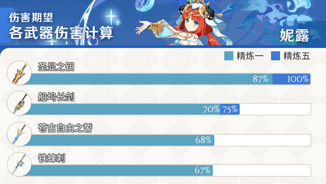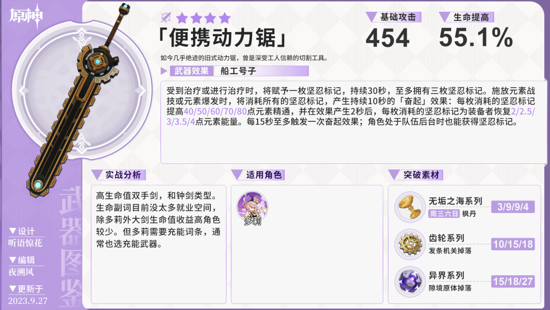 原神·武器测评丨再铸四星荣光!船坞长剑和便携动力锯哪些角色能用原神 - 新闻星发布于 2023-10-14关注 大家好!这里是听语惊花,随着4.1版本更新,新枫丹限定祈愿武器陆续上线,本次带来限定四星武器——船坞长剑、便携动力锯的抽取分析建议。 记得去年的这个时候,以西福斯的月光为代表的须弥版本限定武器可谓是红极一时。其亮眼的武器特效一登场便洛阳纸贵,一些玩家在抽取西福斯的时候同样也抽到了圣显之钥,最终如愿以偿获得了妮露,加入了种门这一版本答案。不知道一年过去,新的枫丹系列武器是否还能再续须弥限武的辉煌呢?请听下文分解。 从武器的白值来看,本次UP的单手剑和双手剑都是以生命值为副词条的武器。而武器的被动效果是一样的,都是通过治疗/被治疗来叠层,依靠叠层数获得元素精通提升和额外的充能效率。定性的来说,武器适合生命占模角色、治疗型辅助角色来使用,可以同时提供角色所需要的生命值、精通和充能。这样的多维度能力提升的武器在之前的五星武器里比较常见,但是和其他的四星武器相比起来武器的词条数给的就比较多了,均有不错的适用性。因为单手剑和双手剑尽管副词相同,但词条和白值分配有所区别,在定量计算这一块有点不太一样,更偏向于不吃攻击白值的角色。 船坞长剑部分 还没看明白武器触发效果的旅行者可能会问:不站场、纯后台的雷治疗角色——久岐忍怎么能使用这把武器?其实,武器的叠层,除了受到治疗,还能通过治疗队友完成叠层。触发效果既可以通过释放元素战技(E),还能通过释放元素爆发(Q)来触发。久岐忍元素战技的15秒CD,刚好契合武器效果的触发CD。生命值、元素精通都是久岐忍需要的属性,唯独充能不是久岐忍刚需的属性。给久岐忍的情况下这把武器能和西福斯的月光打的有来有回,满精比西福斯多出80左右的元素精通的同时还多出40大生命,代价是少了个加全队充能的被动。总的来说,低精情况下,精通并不高,不太建议给久岐忍;至少要抽到精3(>165精通)才建议给久岐忍 同样作为生命辅助角色的班尼特在一定程度上来说也比较适合这把武器。因为之前副词条为生命值的单手剑只有一把圣显之钥,所以这把单手剑严格意义上来说是平民能接触到的第一把单手剑,如果白值能再高一点就能算得上是班尼特专武了,但是白值还是给了常规的510有点可惜。如果进草体系的队伍倒是可以携带原木刀,不进草体系的队伍则可以携带这把单手剑 生命值+精通的单手剑,是圣显之钥的唯一平替四星单手剑,副词条加生命值的单手剑整个提瓦特找不出第三把。因此推荐妮露使用。但是为了吃到精通的武器效果,建议队伍编入治疗角色。比如心海、白术、瑶瑶等。下表列出了携带不同武器时,妮露单个丰穰之核造成的伤害比(以精炼5专武为100%基准) 理由同上。加生命的单手剑有效词条比较多,但是总体因为缺乏治疗手段相当于是白板武器。硬吃的话也可以,队伍里面的法器队友带一个试作金珀就能吃满。 便携动力锯部分双手剑由于数值分配的不是很优秀因此存在一些问题,相比单手剑来说就不是那么泛用了。 作为治疗角色的大剑多莉,相比生命词条的大剑,选择充能向的武器才是更明智的选择。大招高额的能量需求基本上不会过多考虑除了西风大剑之外的双手剑,这把双手剑虽然能提供部分的能量回复,但充能给的确实不是很多,属于可以用,但缺失的充能部分需要圣遗物来补齐。其他的大剑角色则不太行,比如早柚(充能要求高)、卡维(虽然能完美吃到被动但是不需要生命值,而且需要高攻击力)等角色使用起来效果不佳。 作为枫丹版本的限定武器,和须弥同系列的武器相比各有千秋,总体来说没有特别出挑的机制,不太适合为了这两把四星武器专门下卡池抽取。不过由于该系列的武器仍没有完全公开,我们将持续跟踪报道。期待这两把武器在之后的版本中有更精彩的表现。今天的攻略就到这里,我是听语惊花,我们下期再见。作者:原神西风驿站, 听语惊花