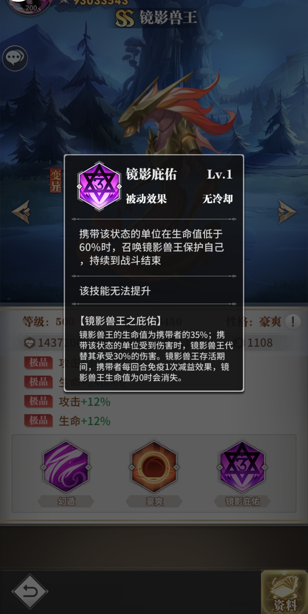 携带该状态的单位在生命值低于60%时,召唤镜影兽王保护自己持续到战斗结束。(镜影兽王的生命值为携带者的35%,携带该状态的单位受到伤害时,镜影兽王代替其承受30%的伤害。镜影兽王存活期间,携带者每回合免疫1次减益效果,镜影兽王生命值为0时会消失。)