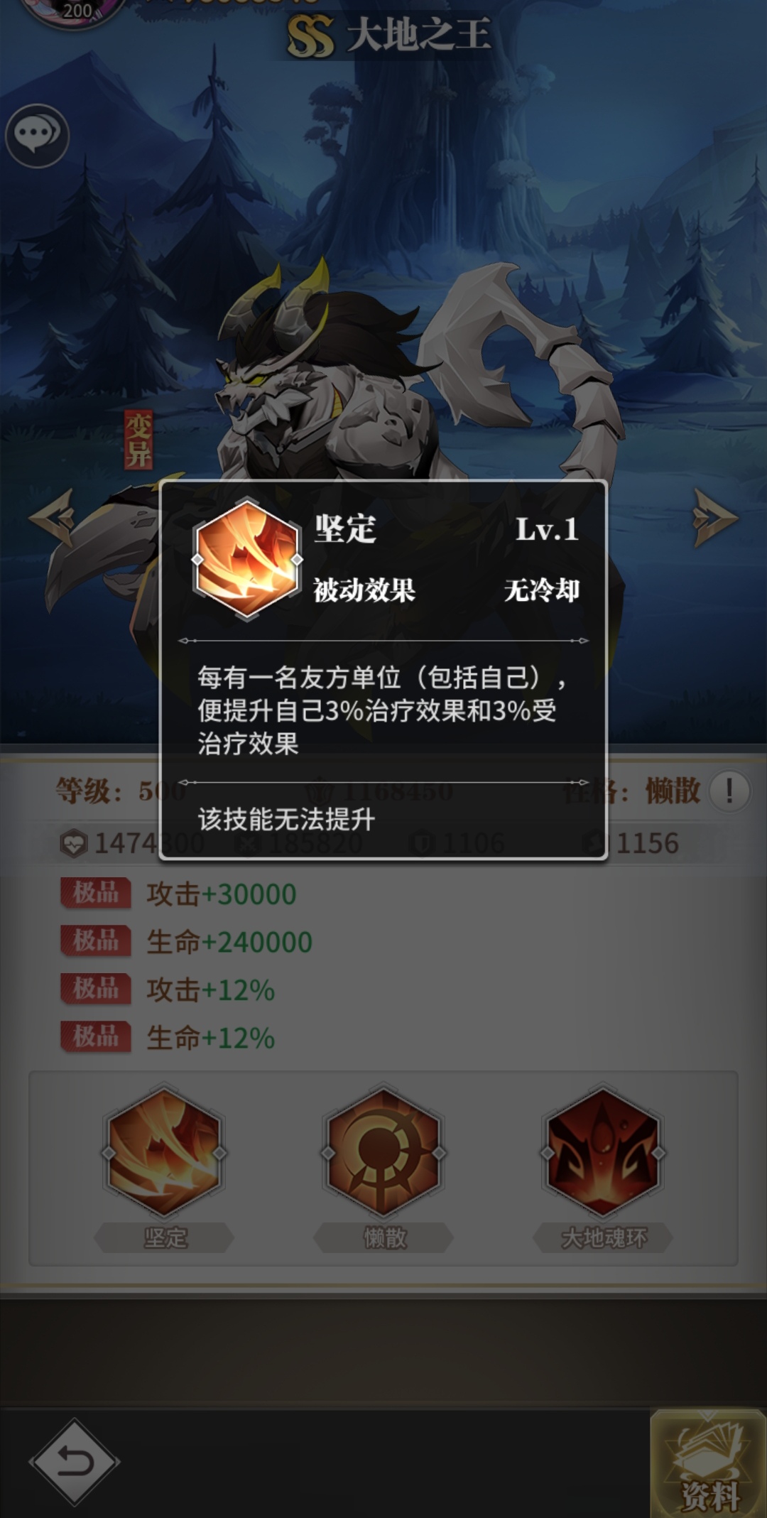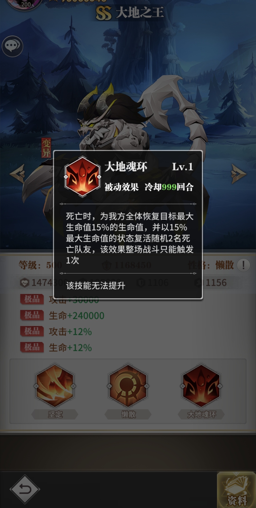 大地魂环:死亡时,为我方全体恢复目标最大生命值15%的生命值,并以15%最大生命值的状态复活随机2名死亡队友,该效果整场战斗只能触发1次
