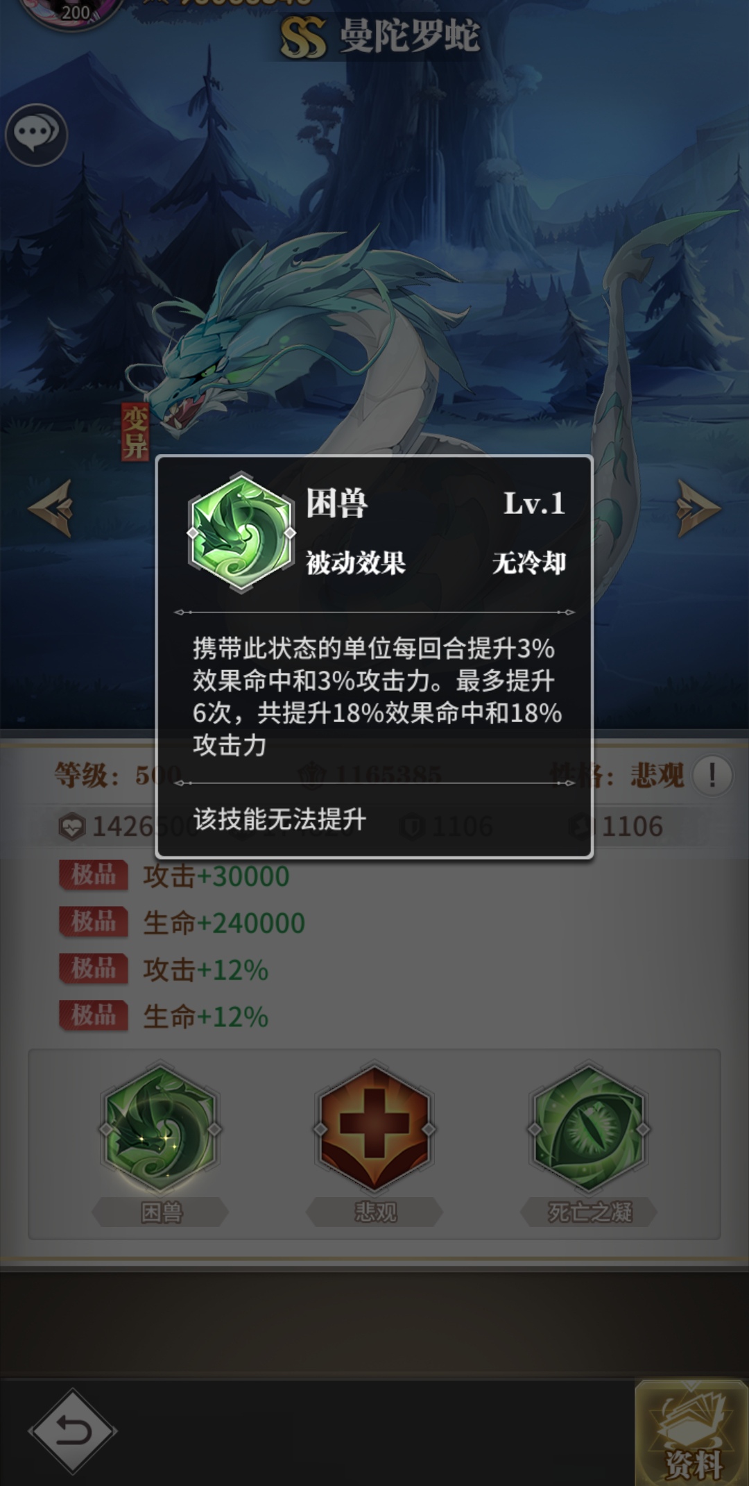 困兽:携带此状态的单位每回合提升3%效果命中和3%攻击力。最多提升6次,共提升18%效果命中和18%攻击力