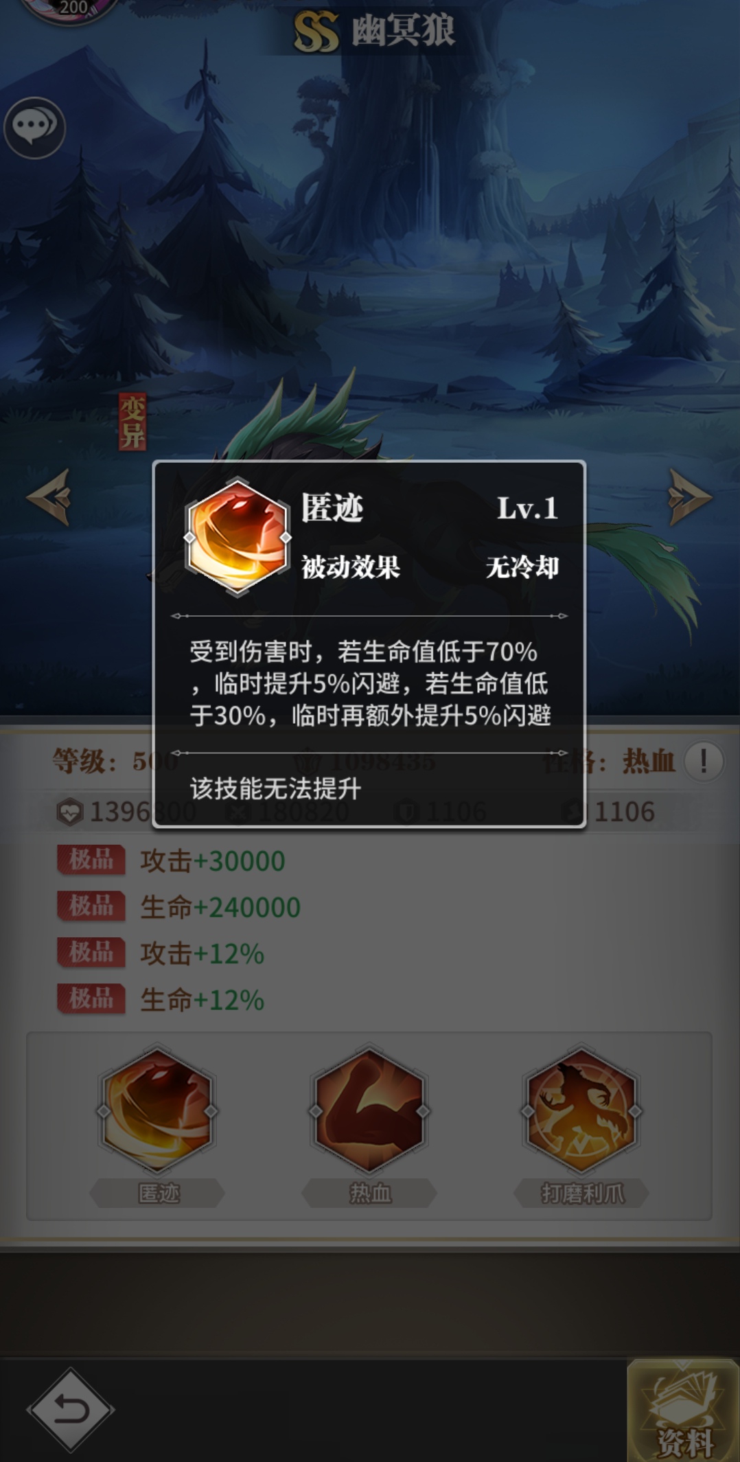 匿迹:受到伤害时,若生命值低于70%,临时提升5%闪避,若生命值低于30%,临时再额外提升5%闪避