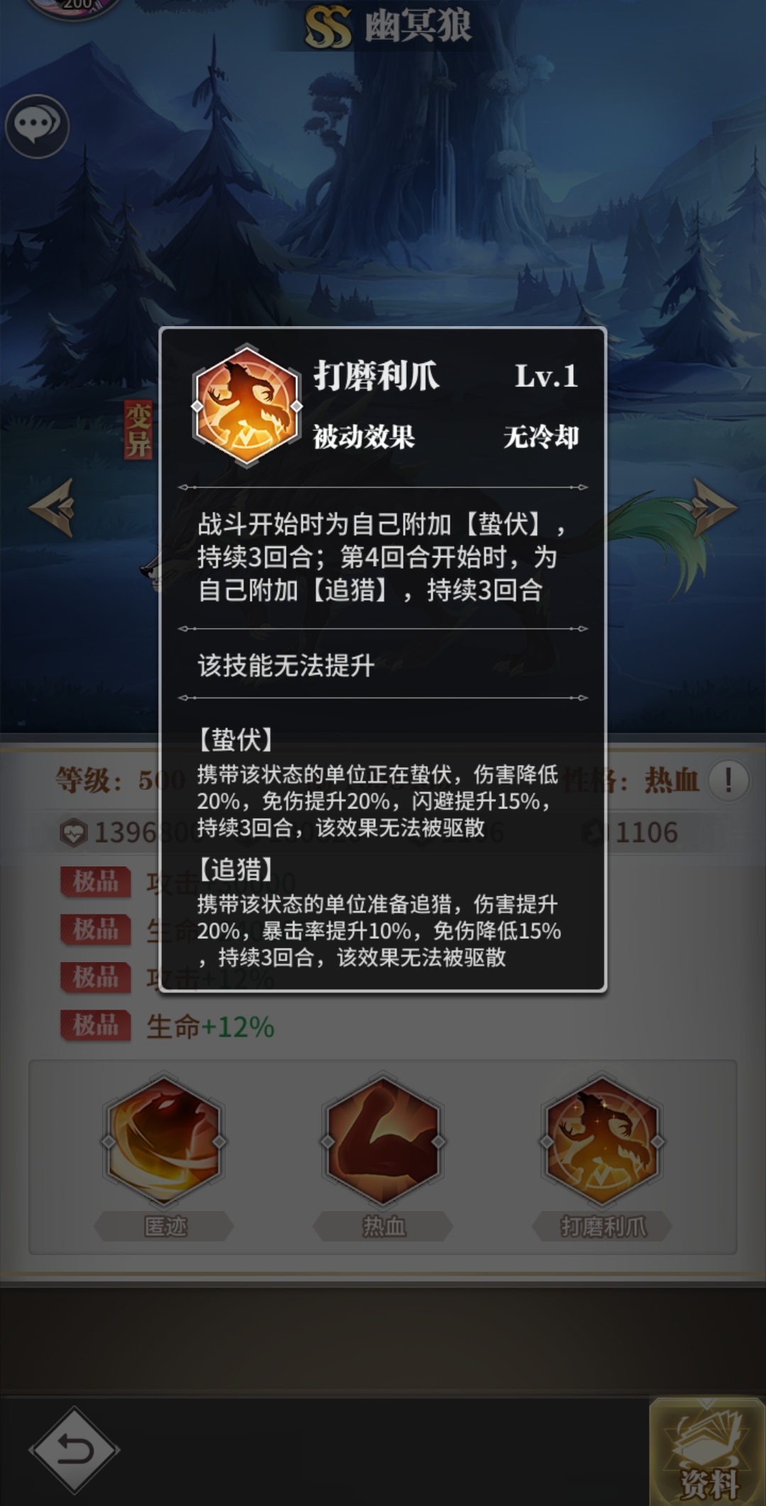 打磨利爪:战斗开始时为自己附加【蛰伏】,持续3回合;第4回合开始时,为自己附加【追猎】,持续3回合