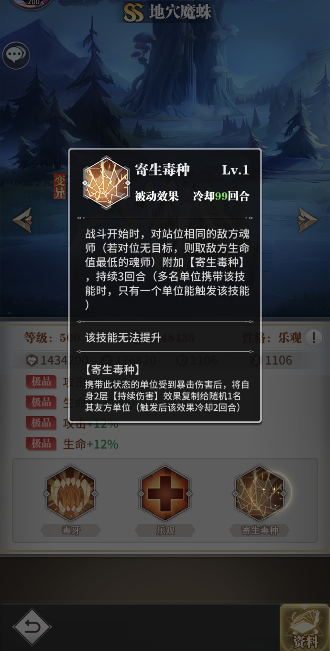 寄生毒种:战斗开始时,对站位相同的敌方魂师(若对位无目标,则取敌方生命值最低的魂师)附加【寄生毒种】,持续3回合,多名单位携带该技能时,只有一个单位能触发该技能)