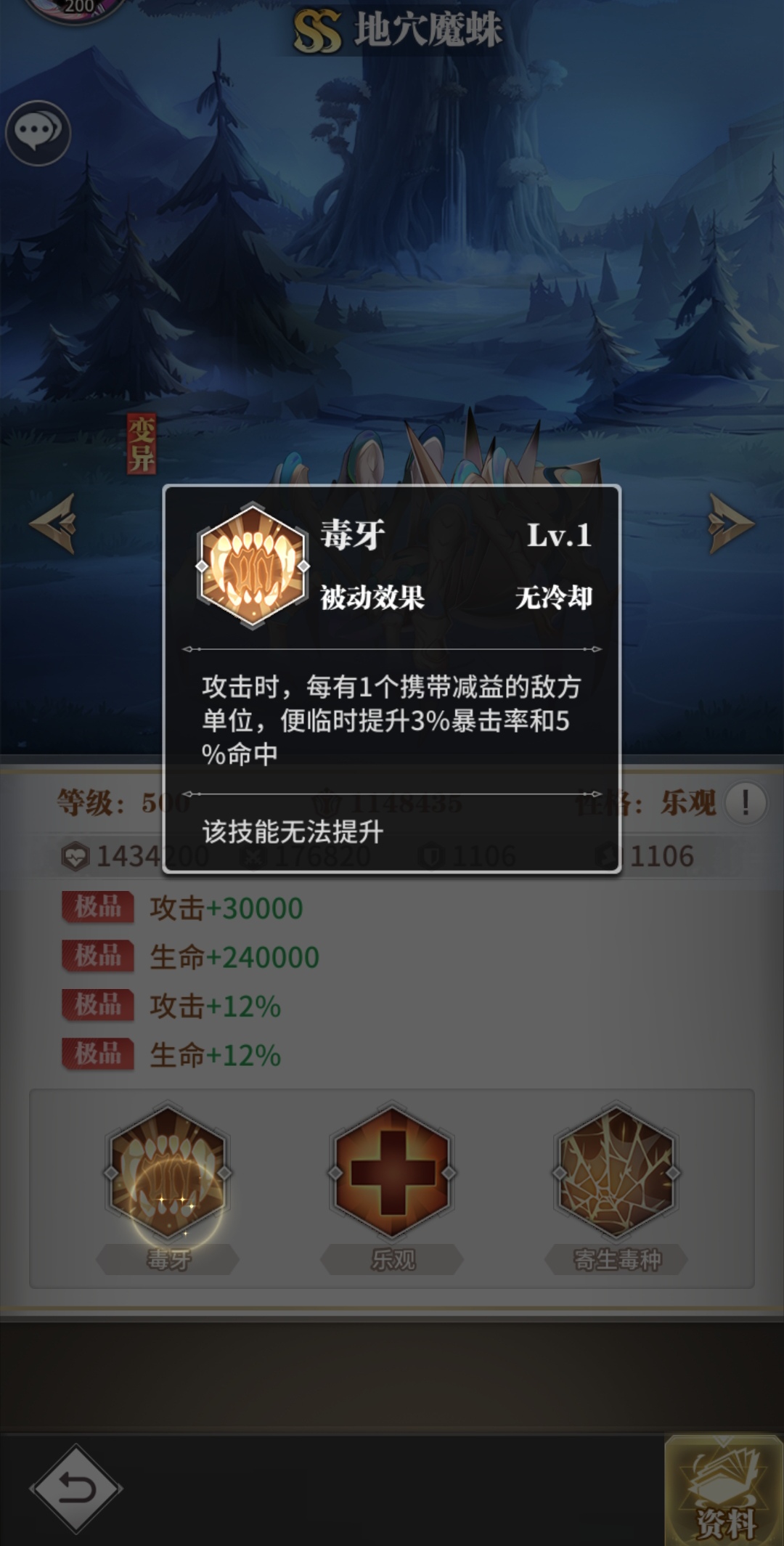 毒牙:攻击时,每有1个携带减益的敌方单位,便临时提升3%暴击率和5%命中