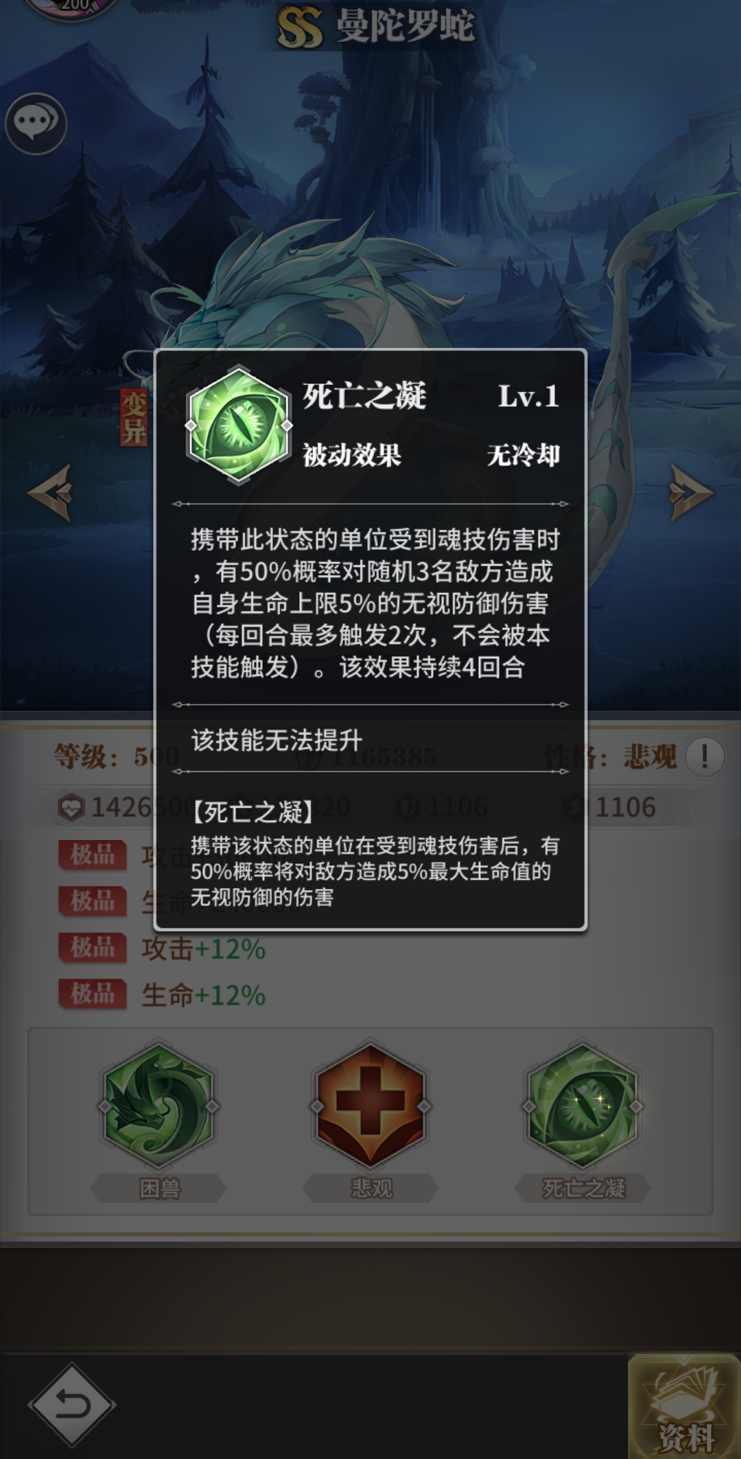 死亡之凝:携带此状态的单位受到魂技伤害时,有50%概率对随机3名敌方造成自身生命上限5%的无视防御伤害(每回合最多触发2次,不会被本技能触发)该效果持续4回合