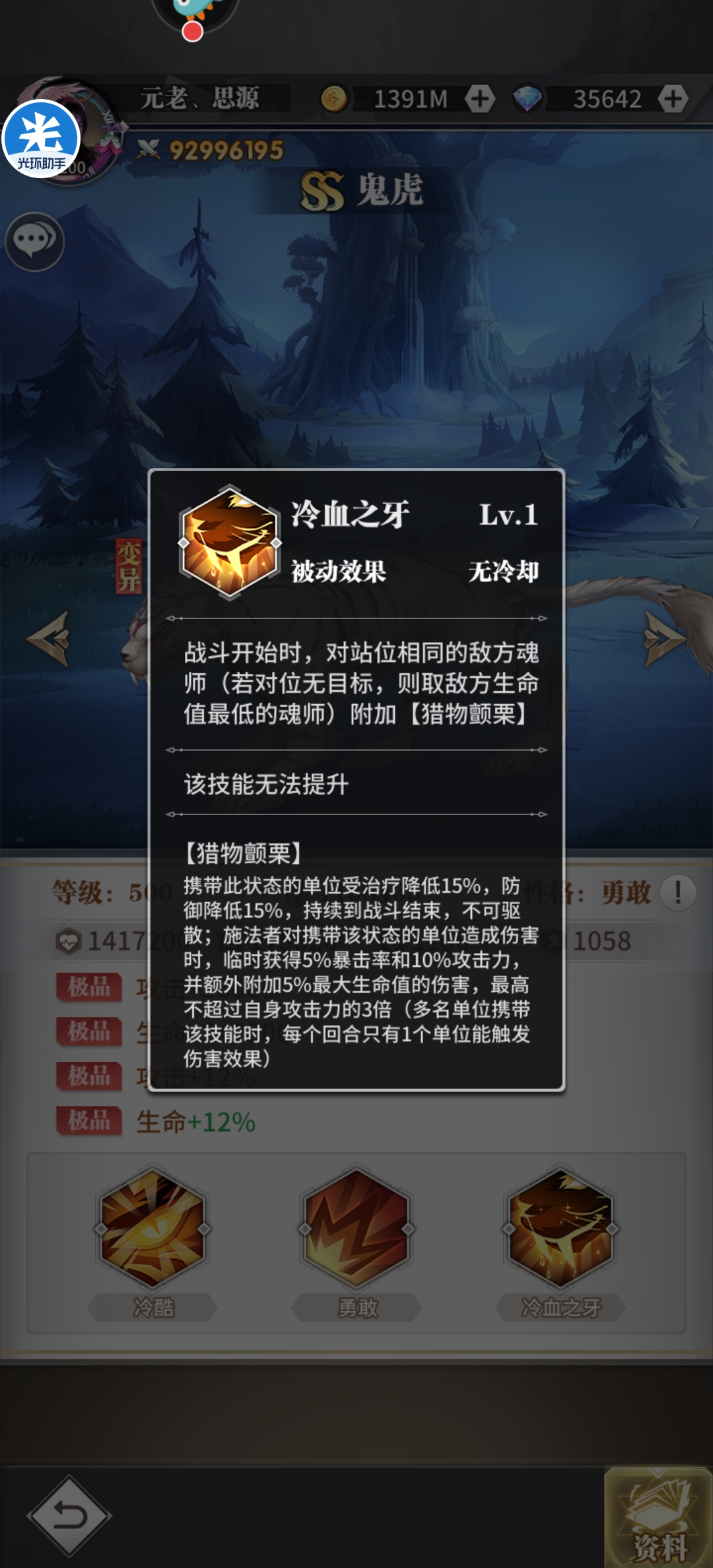 冷血之牙:战斗开始时,对站位相同的敌方魂师(若对位无目标,则取敌方生命值最低的魂师)附加【猎物颤栗】