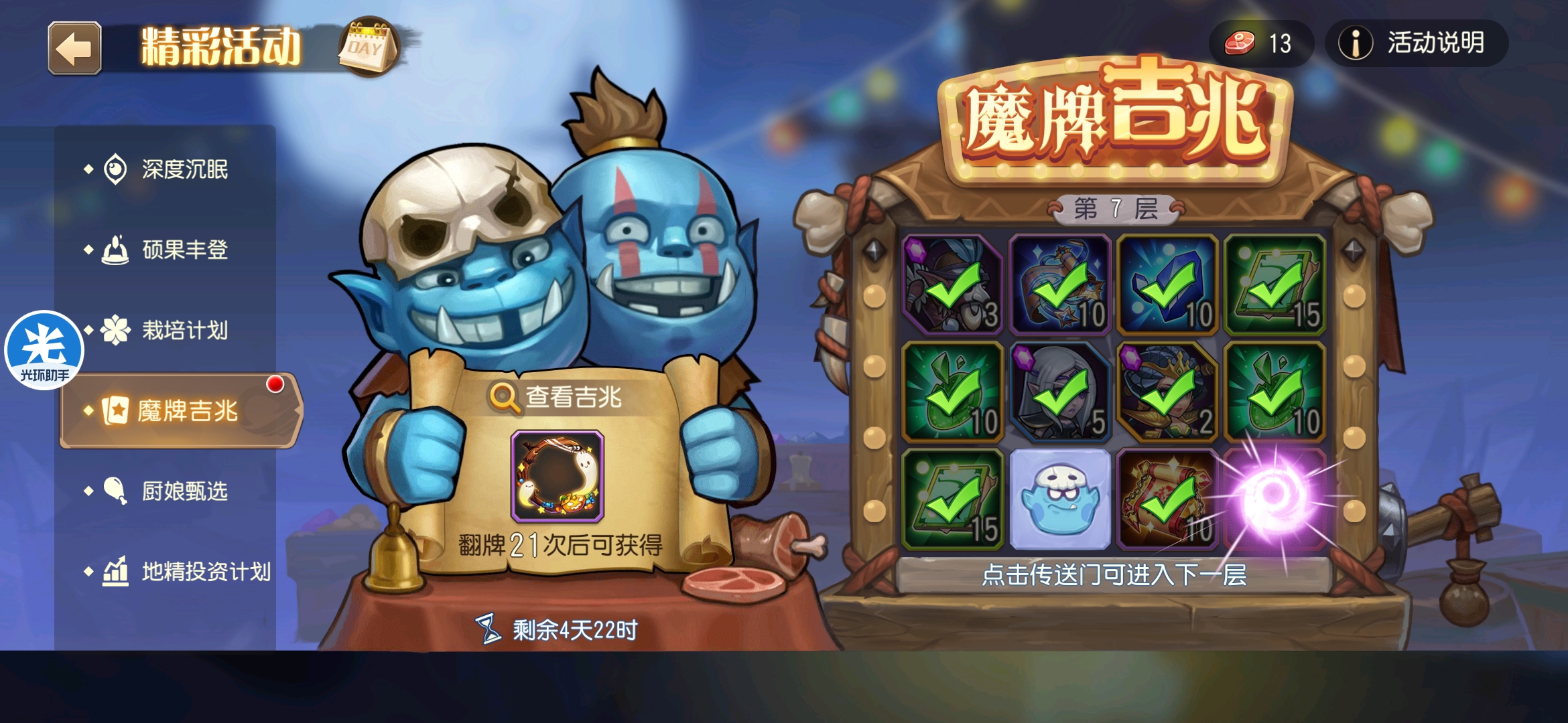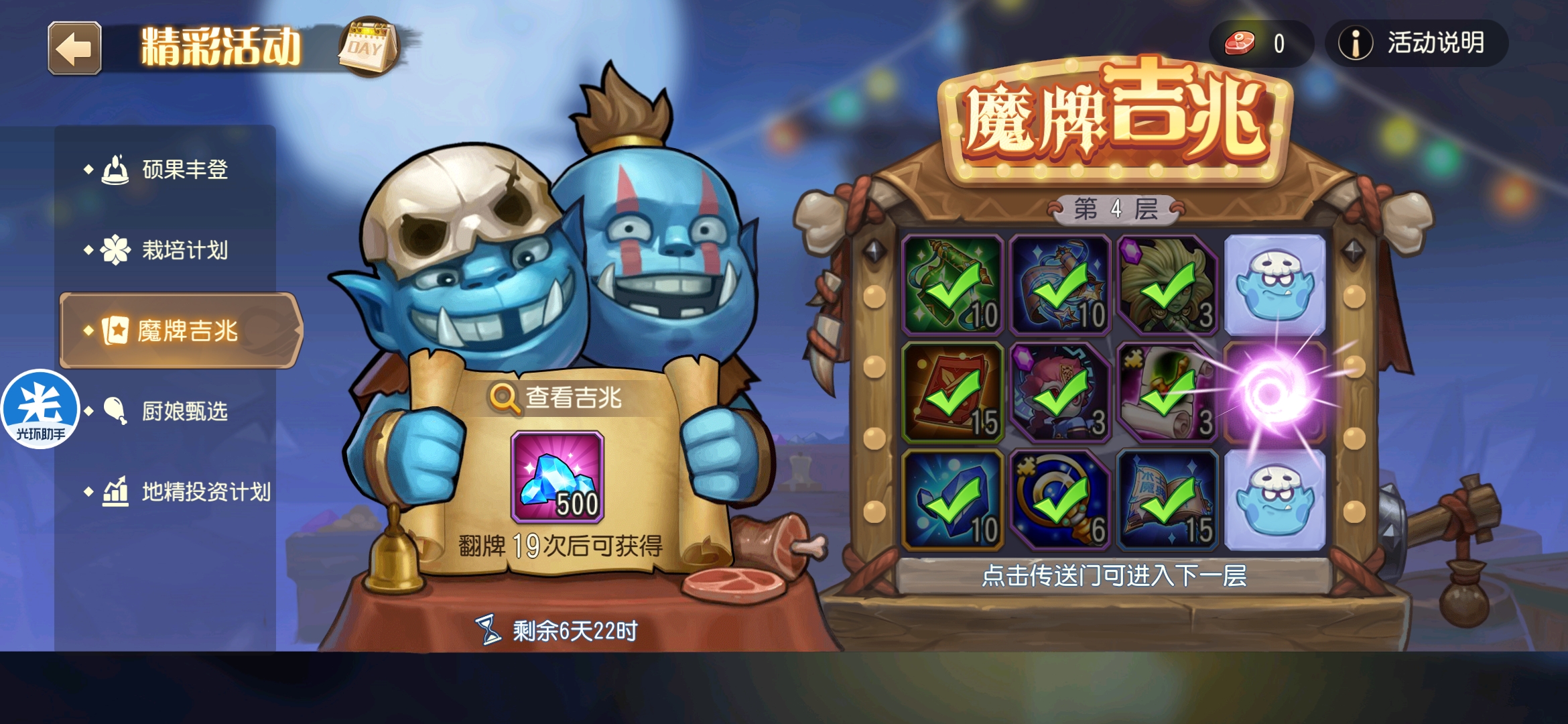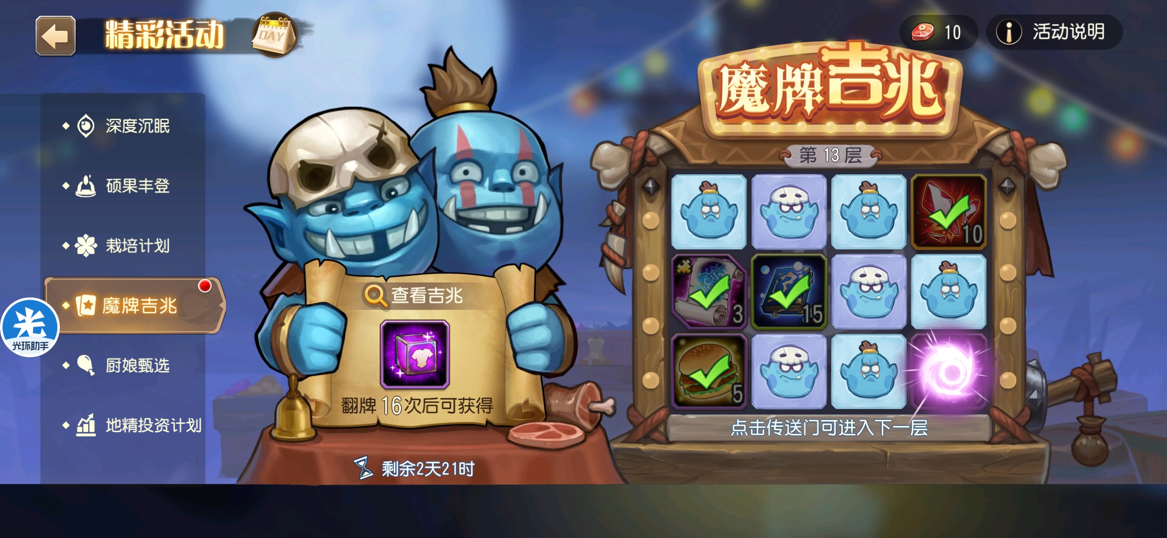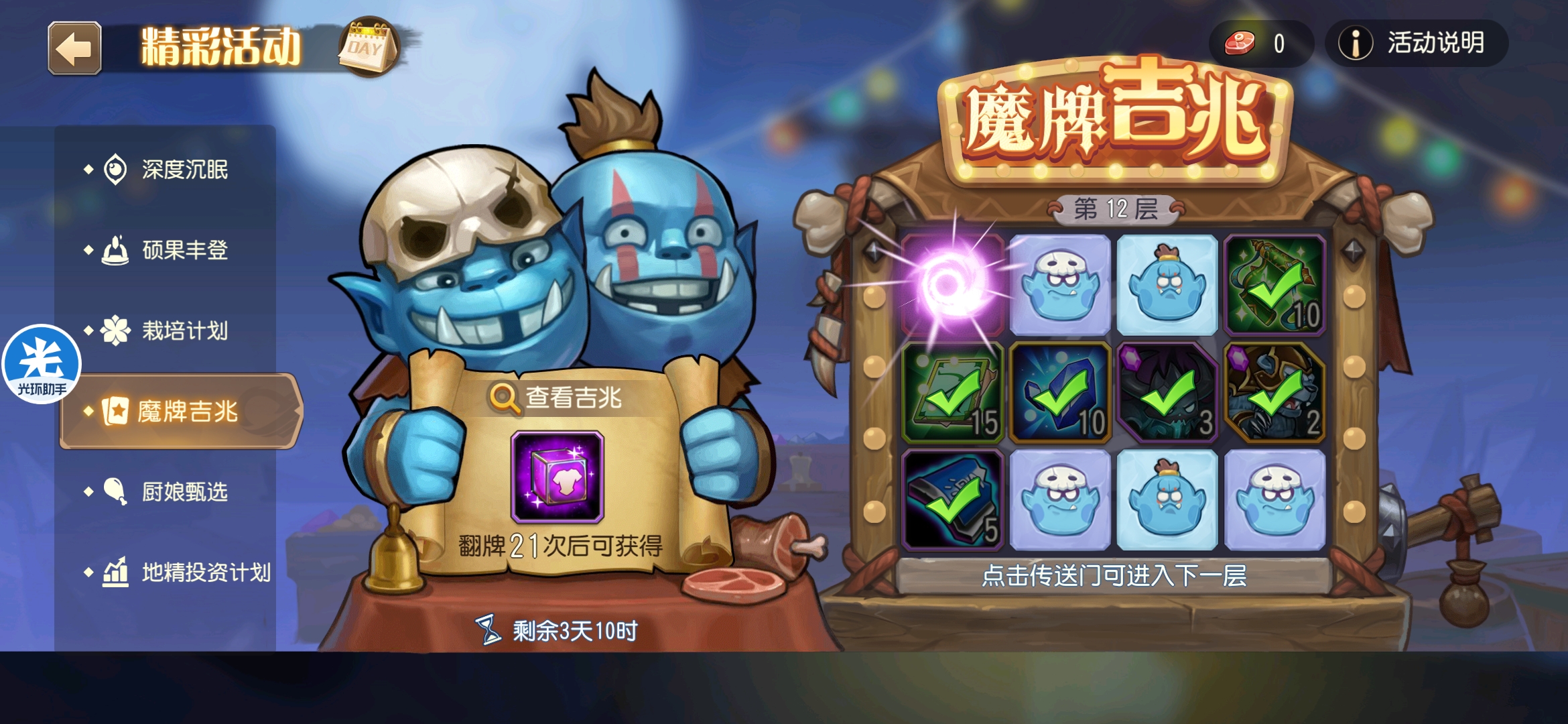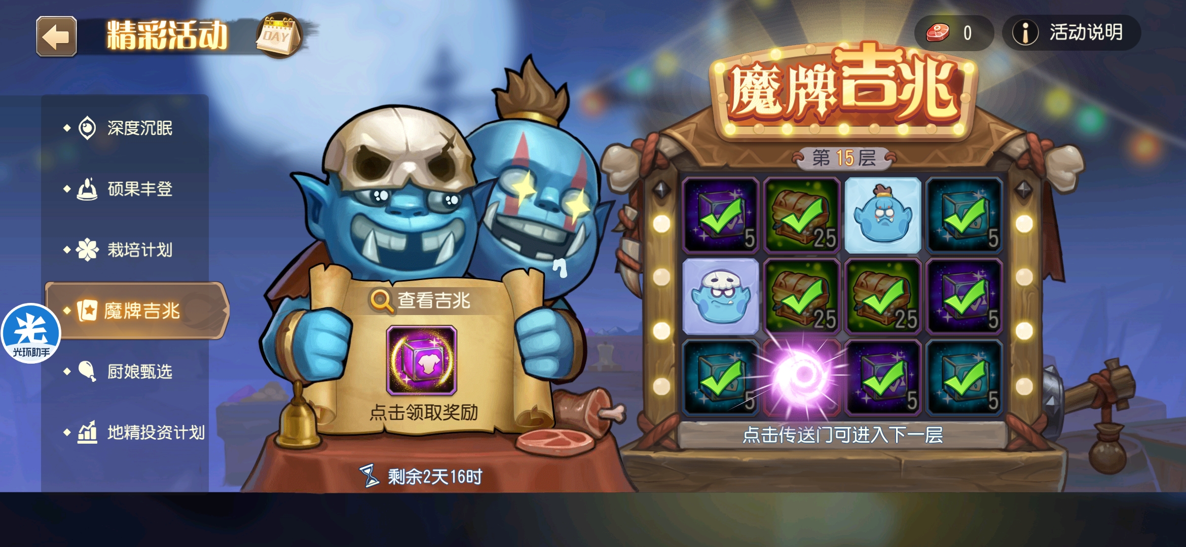 魔牌吉兆活动全奖励(20层)怠惰w发布于 2023-10-15关注每个人奖励不同,我这个只是给大家做个参考。这个活动奖励很好值得六体八体刷。这个活动大概有两个玩法。第一个是快速进入下一层,每五层奖励会更好。第二个就是像我一样拿到需要的奖励,再去下一层。(这个活动所有奖励都有概率翻倍,包括大奖) 这里大奖翻倍了,我就进入了下一层。 这里忘拿术士灵魂石了,本来想拿的。 奖励很好直接全开。 剩下是技能书,没啥用,直接下一层。 剩下两个是技能书,没啥用,直接下一层。