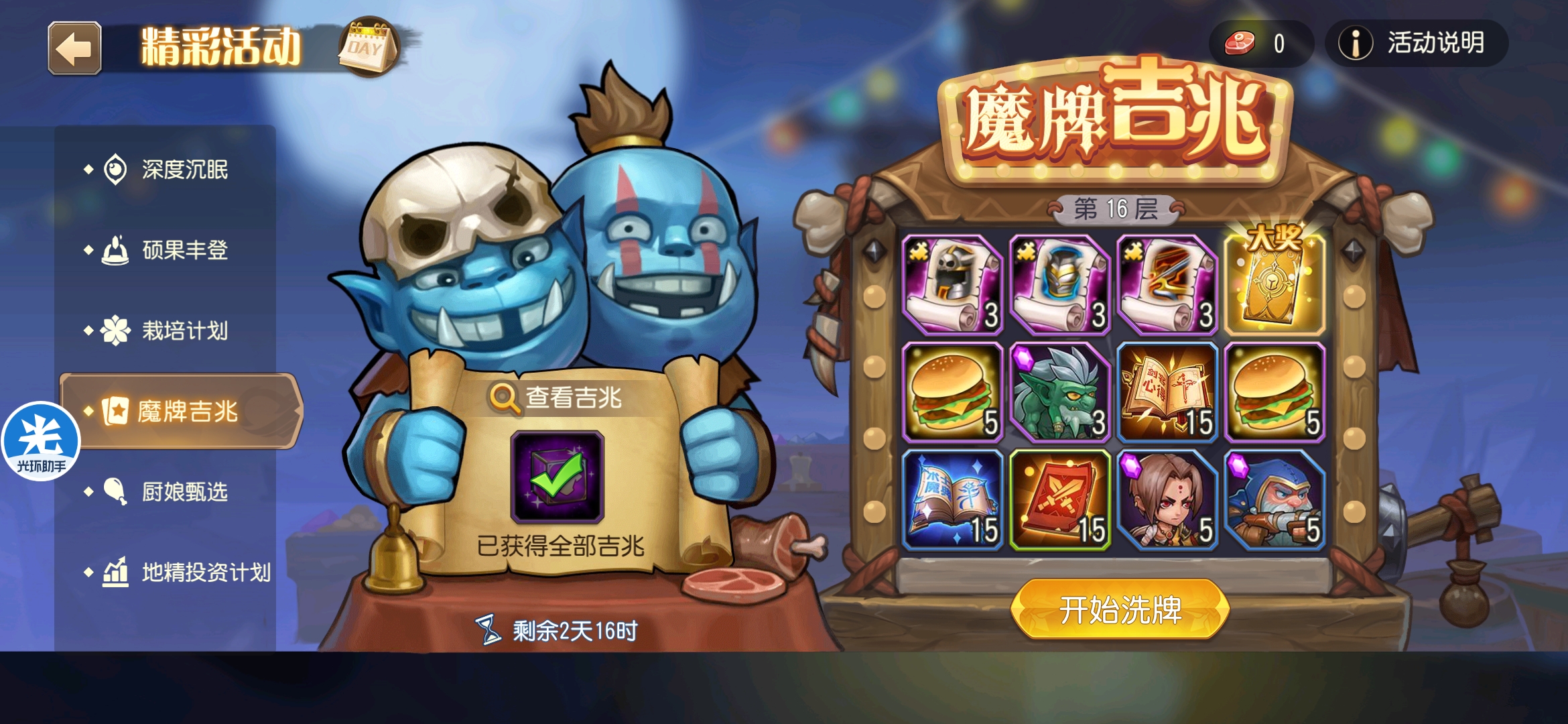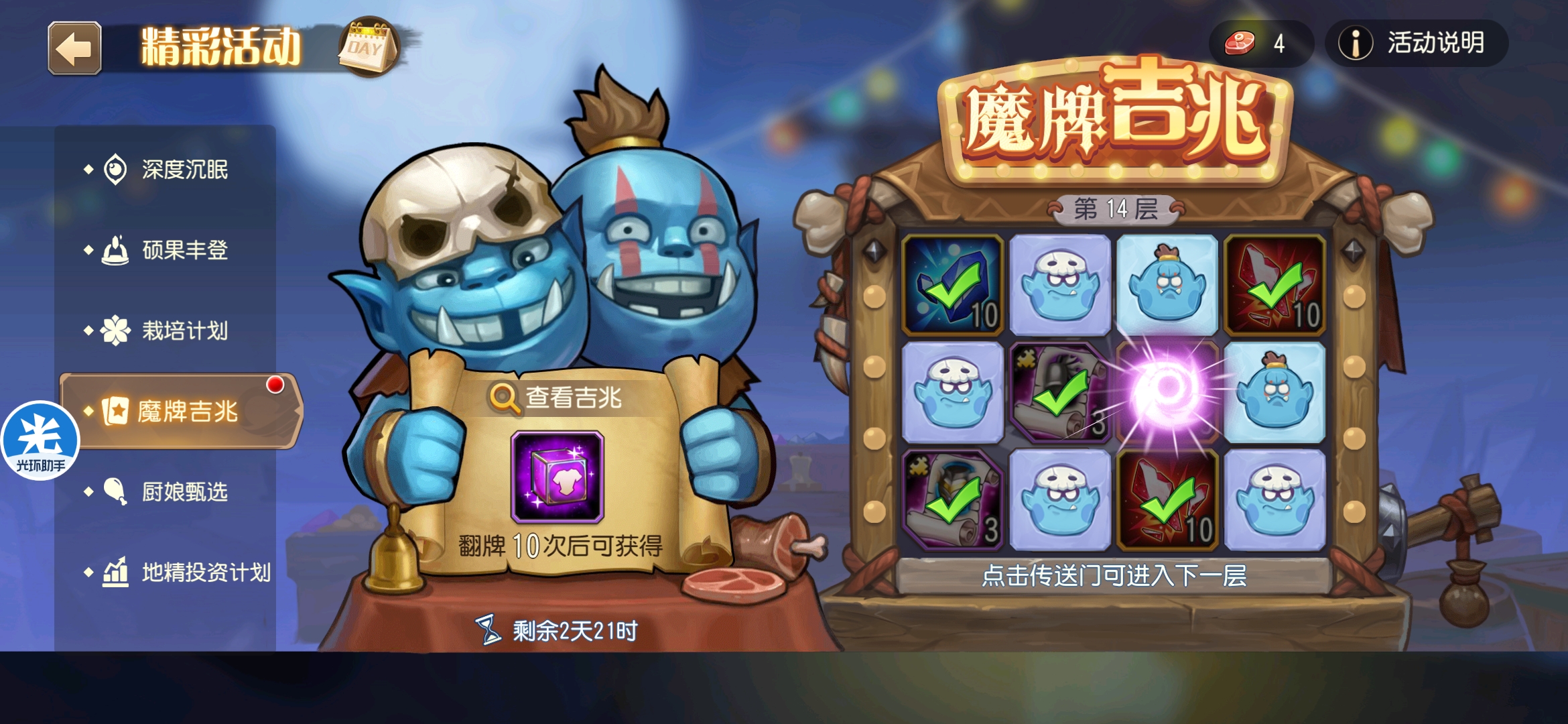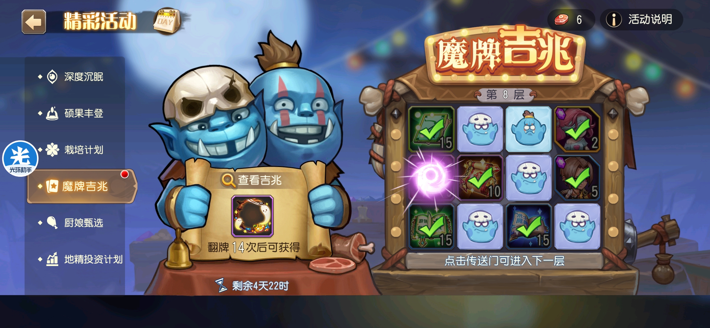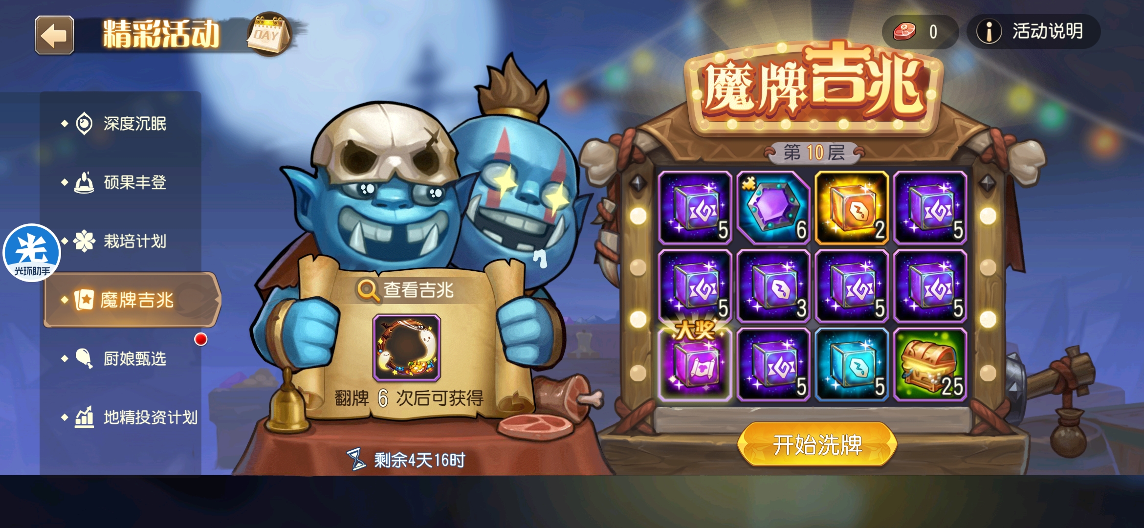 魔牌吉兆活动全奖励(20层)怠惰w发布于 2023-10-15关注每个人奖励不同,我这个只是给大家做个参考。这个活动奖励很好值得六体八体刷。这个活动大概有两个玩法。第一个是快速进入下一层,每五层奖励会更好。第二个就是像我一样拿到需要的奖励,再去下一层。(这个活动所有奖励都有概率翻倍,包括大奖) 这里大奖翻倍了,我就进入了下一层。 这里忘拿术士灵魂石了,本来想拿的。 奖励很好直接全开。 剩下是技能书,没啥用,直接下一层。 剩下两个是技能书,没啥用,直接下一层。