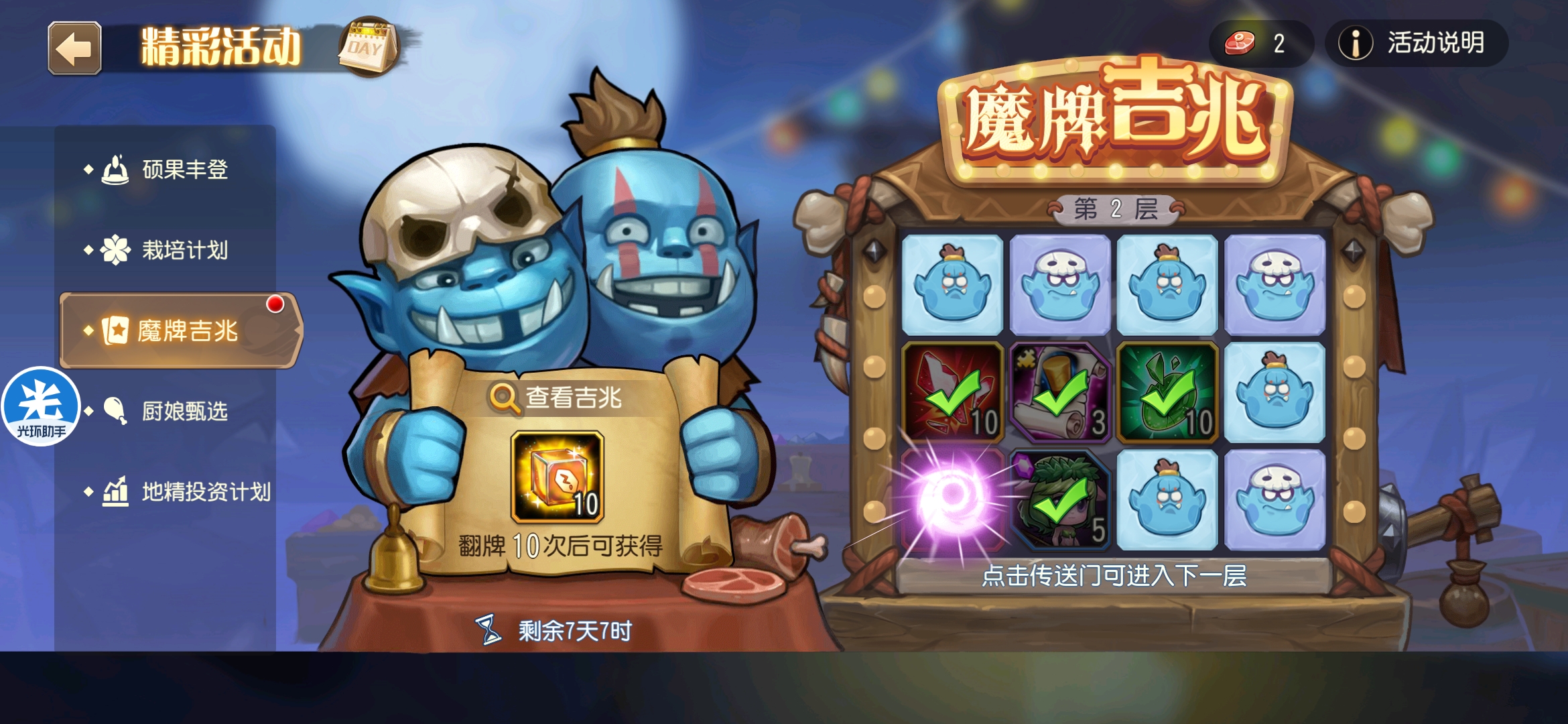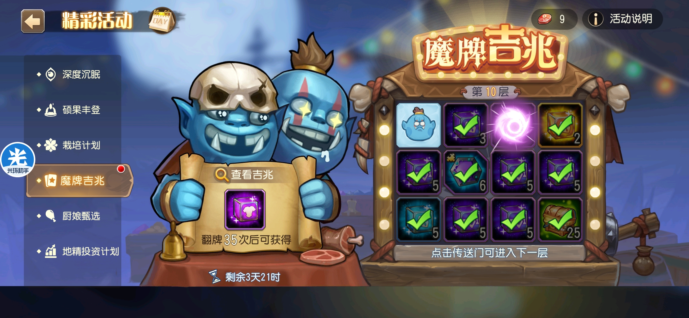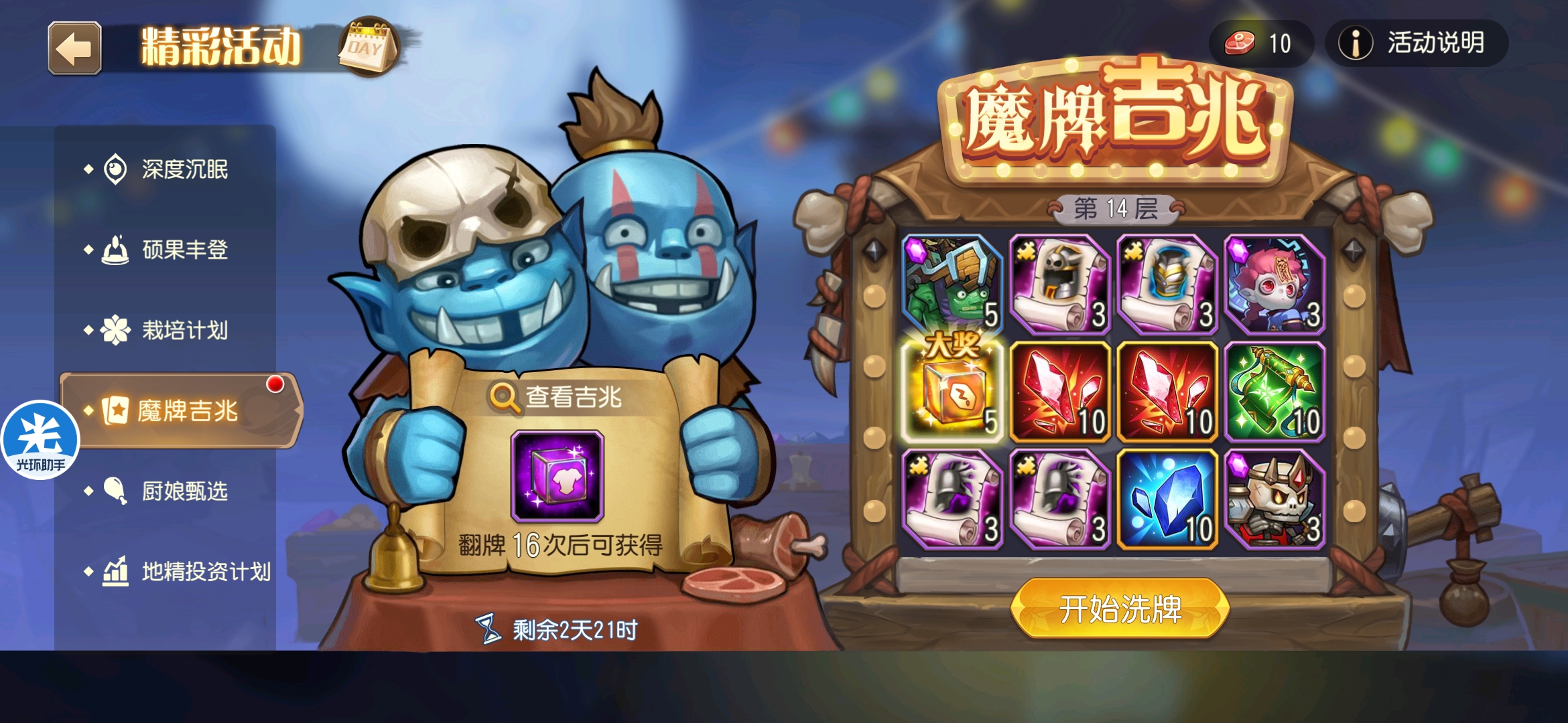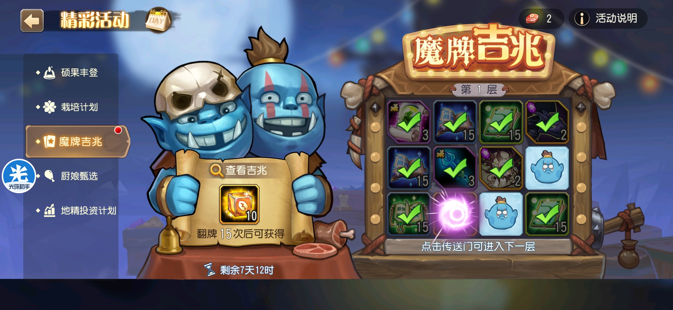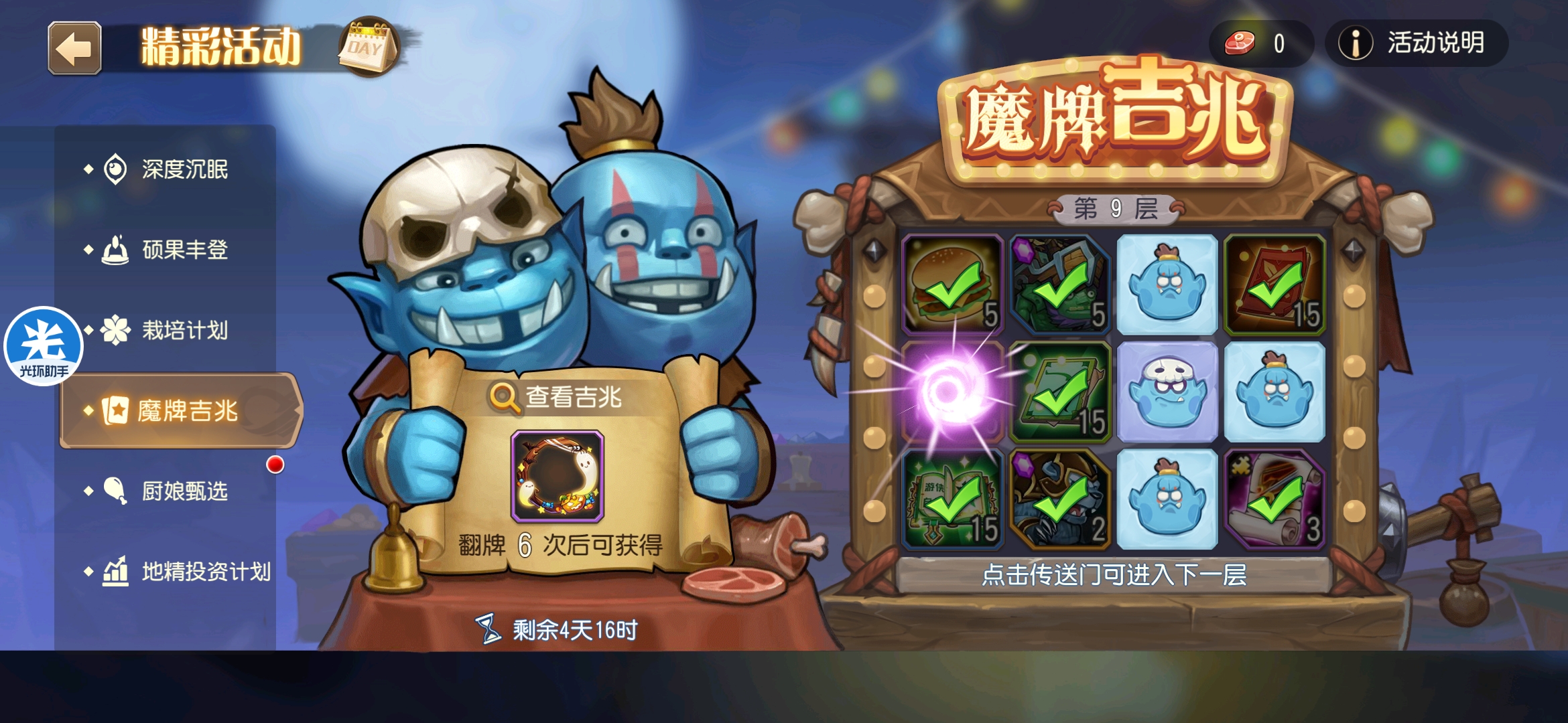 魔牌吉兆活动全奖励(20层)怠惰w发布于 2023-10-15关注每个人奖励不同,我这个只是给大家做个参考。这个活动奖励很好值得六体八体刷。这个活动大概有两个玩法。第一个是快速进入下一层,每五层奖励会更好。第二个就是像我一样拿到需要的奖励,再去下一层。(这个活动所有奖励都有概率翻倍,包括大奖) 这里大奖翻倍了,我就进入了下一层。 这里忘拿术士灵魂石了,本来想拿的。 奖励很好直接全开。 剩下是技能书,没啥用,直接下一层。 剩下两个是技能书,没啥用,直接下一层。