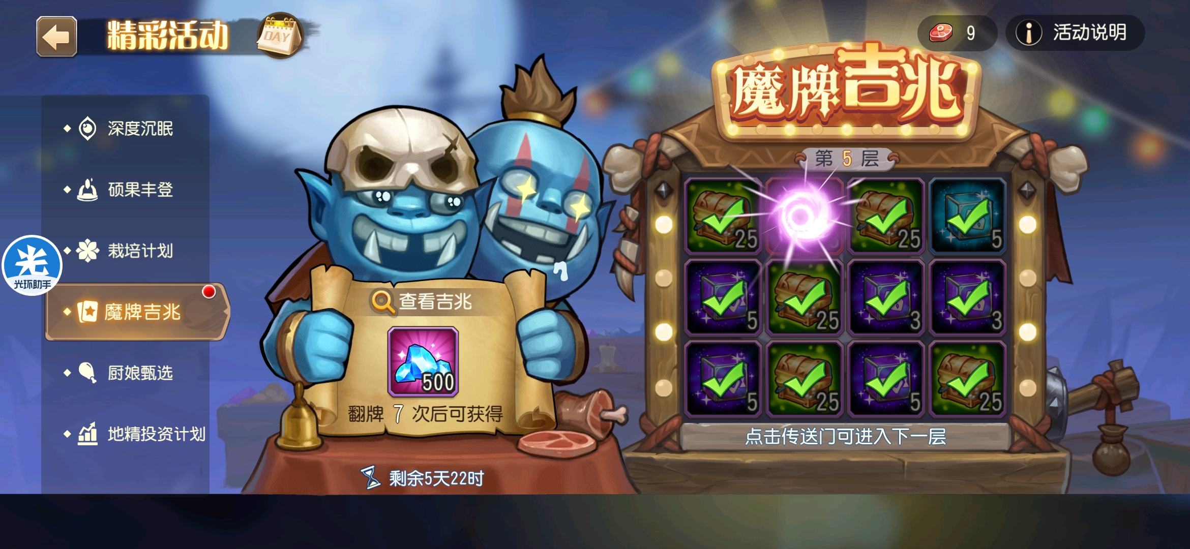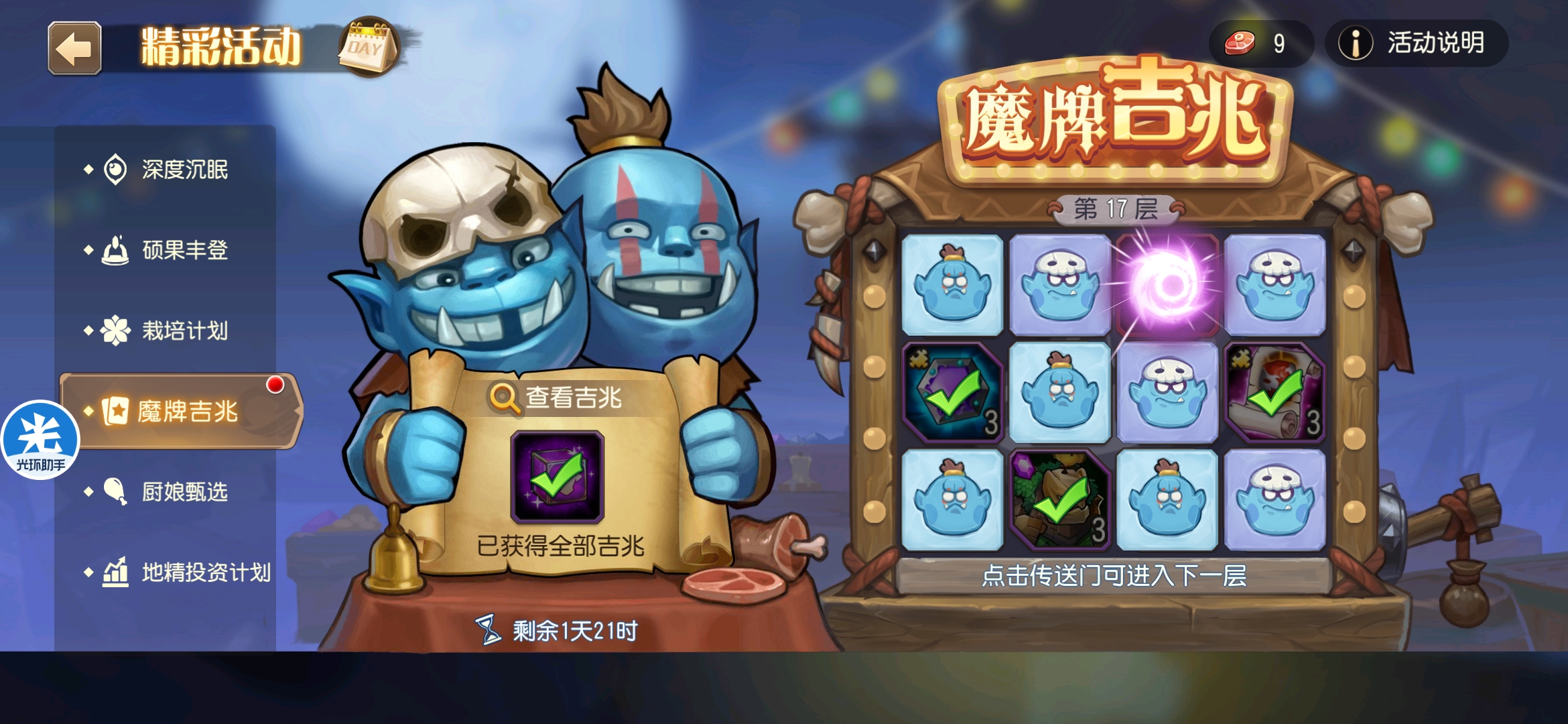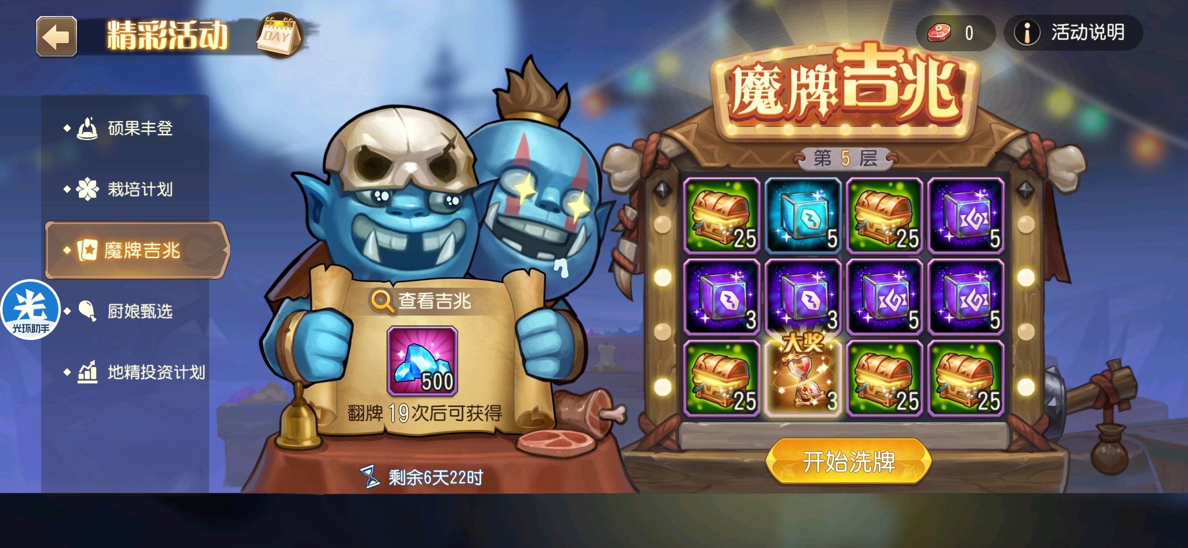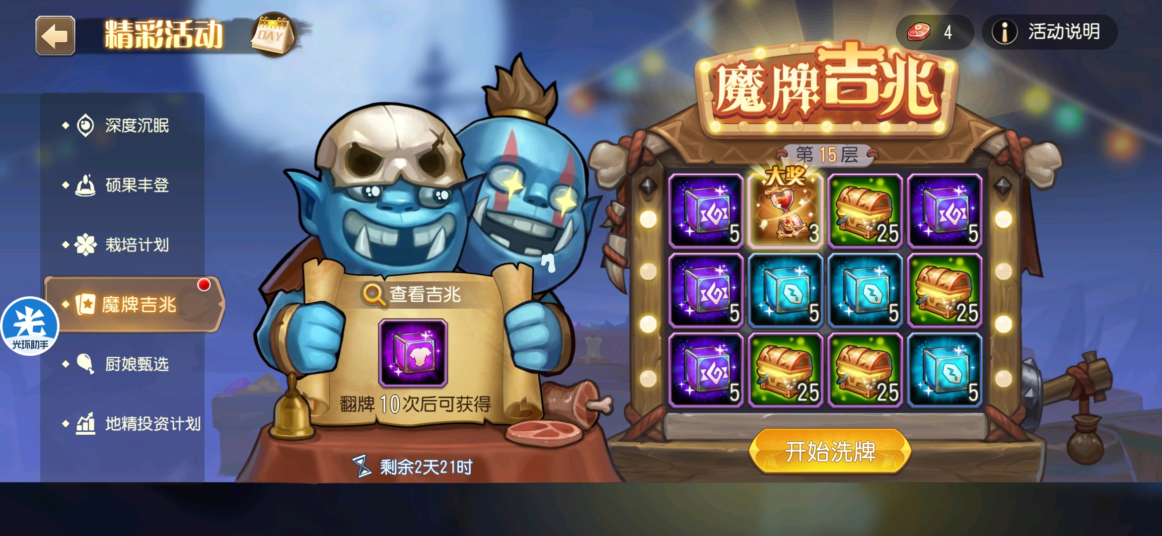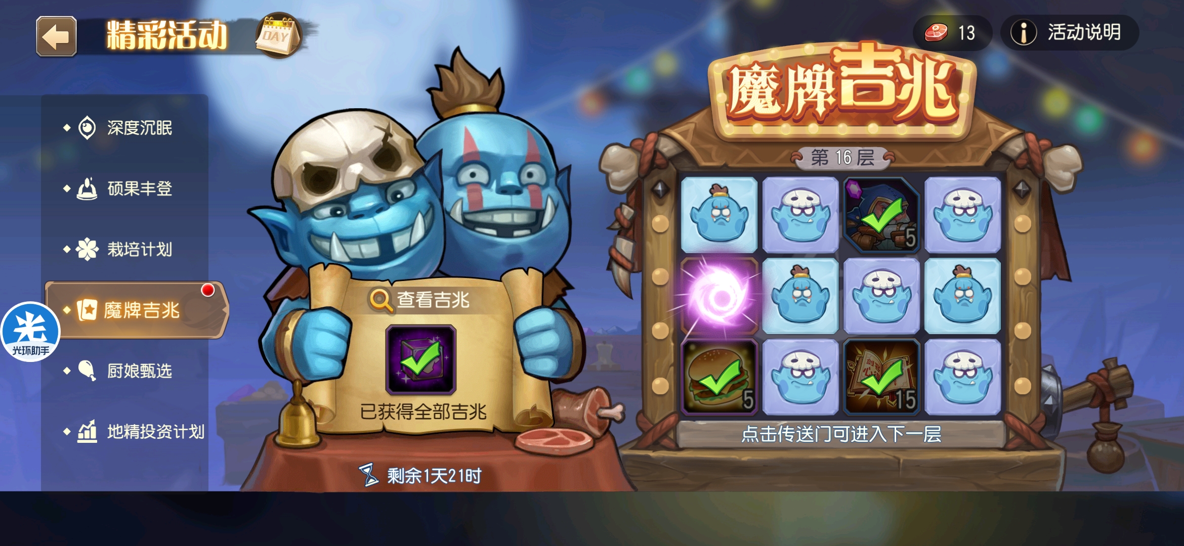 魔牌吉兆活动全奖励(20层)怠惰w发布于 2023-10-15关注每个人奖励不同,我这个只是给大家做个参考。这个活动奖励很好值得六体八体刷。这个活动大概有两个玩法。第一个是快速进入下一层,每五层奖励会更好。第二个就是像我一样拿到需要的奖励,再去下一层。(这个活动所有奖励都有概率翻倍,包括大奖) 这里大奖翻倍了,我就进入了下一层。 这里忘拿术士灵魂石了,本来想拿的。 奖励很好直接全开。 剩下是技能书,没啥用,直接下一层。 剩下两个是技能书,没啥用,直接下一层。