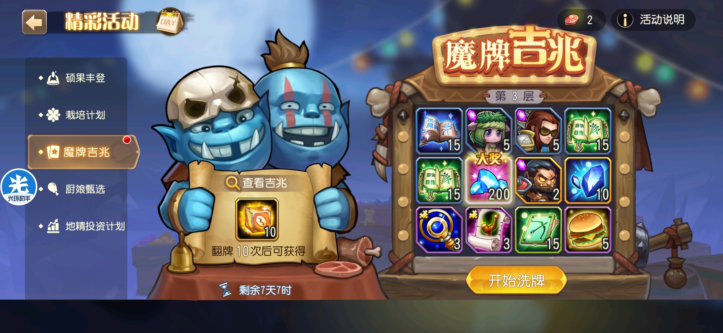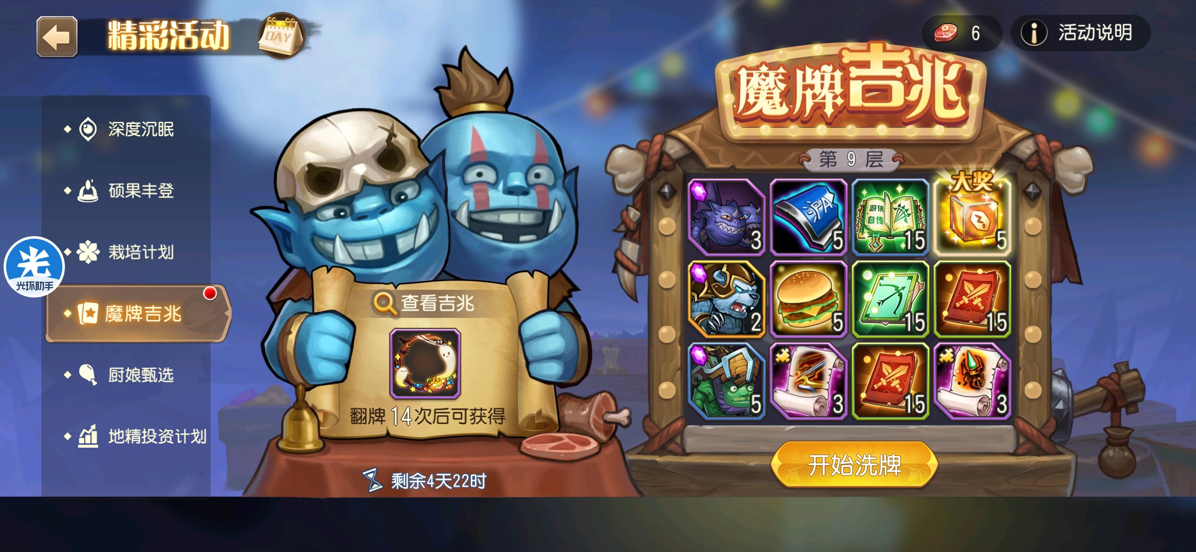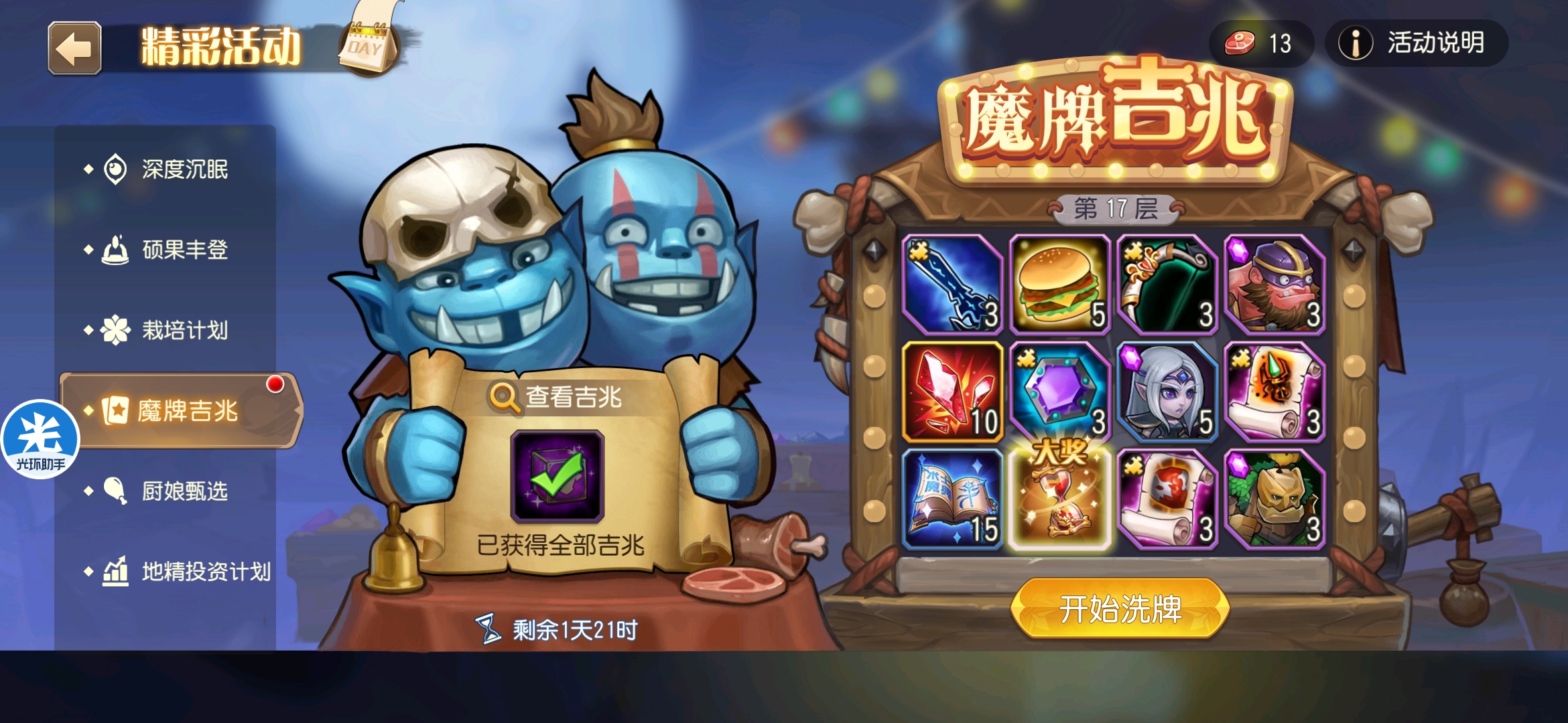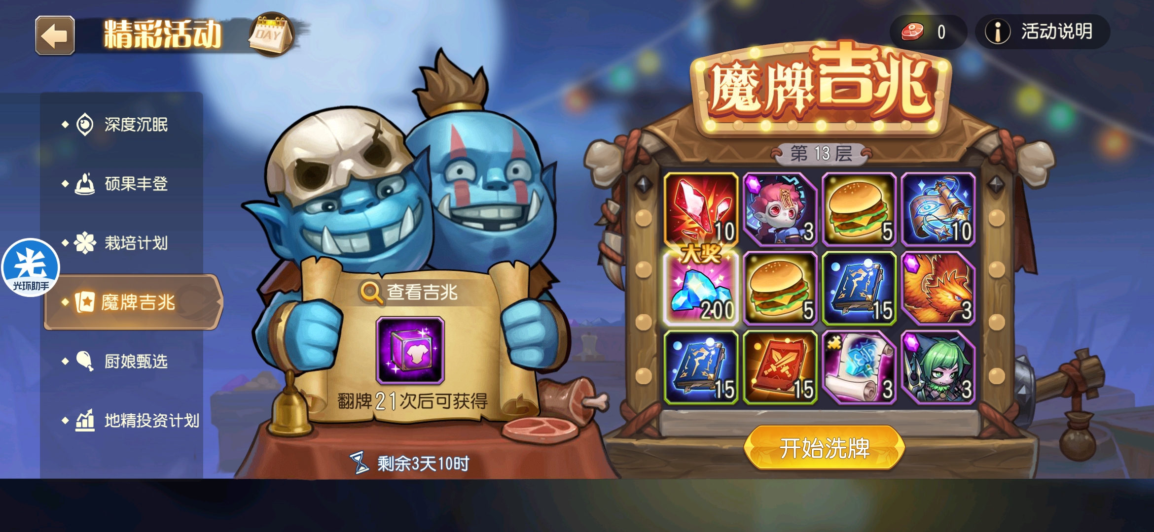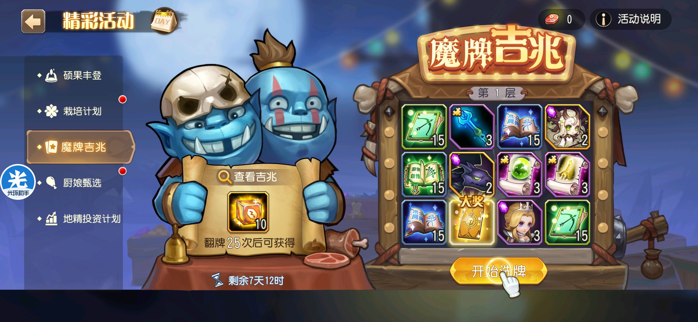 魔牌吉兆活动全奖励(20层)怠惰w发布于 2023-10-15关注每个人奖励不同,我这个只是给大家做个参考。这个活动奖励很好值得六体八体刷。这个活动大概有两个玩法。第一个是快速进入下一层,每五层奖励会更好。第二个就是像我一样拿到需要的奖励,再去下一层。(这个活动所有奖励都有概率翻倍,包括大奖) 这里大奖翻倍了,我就进入了下一层。 这里忘拿术士灵魂石了,本来想拿的。 奖励很好直接全开。 剩下是技能书,没啥用,直接下一层。 剩下两个是技能书,没啥用,直接下一层。