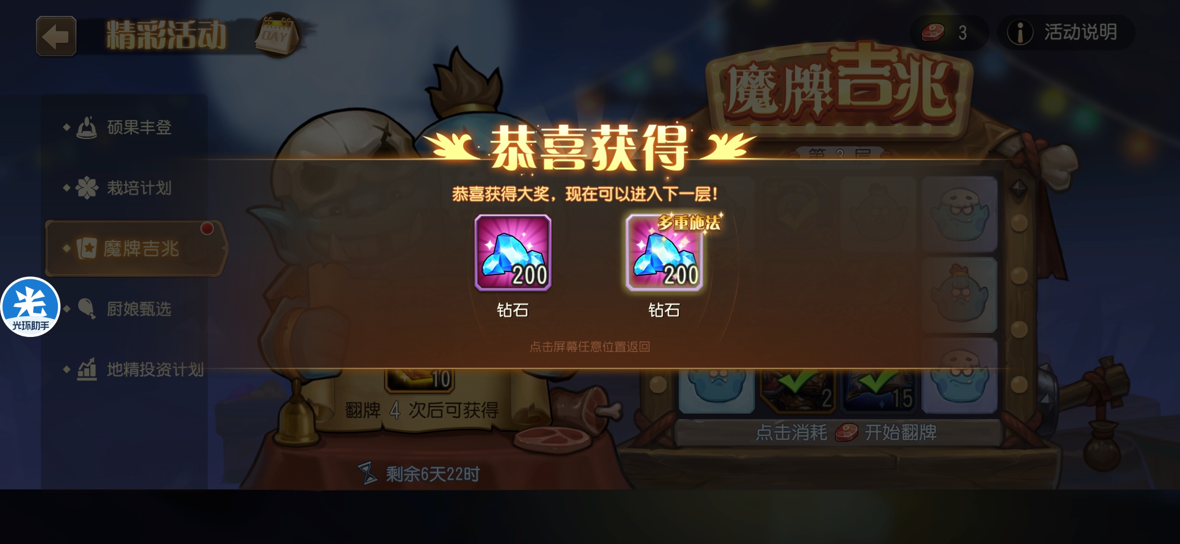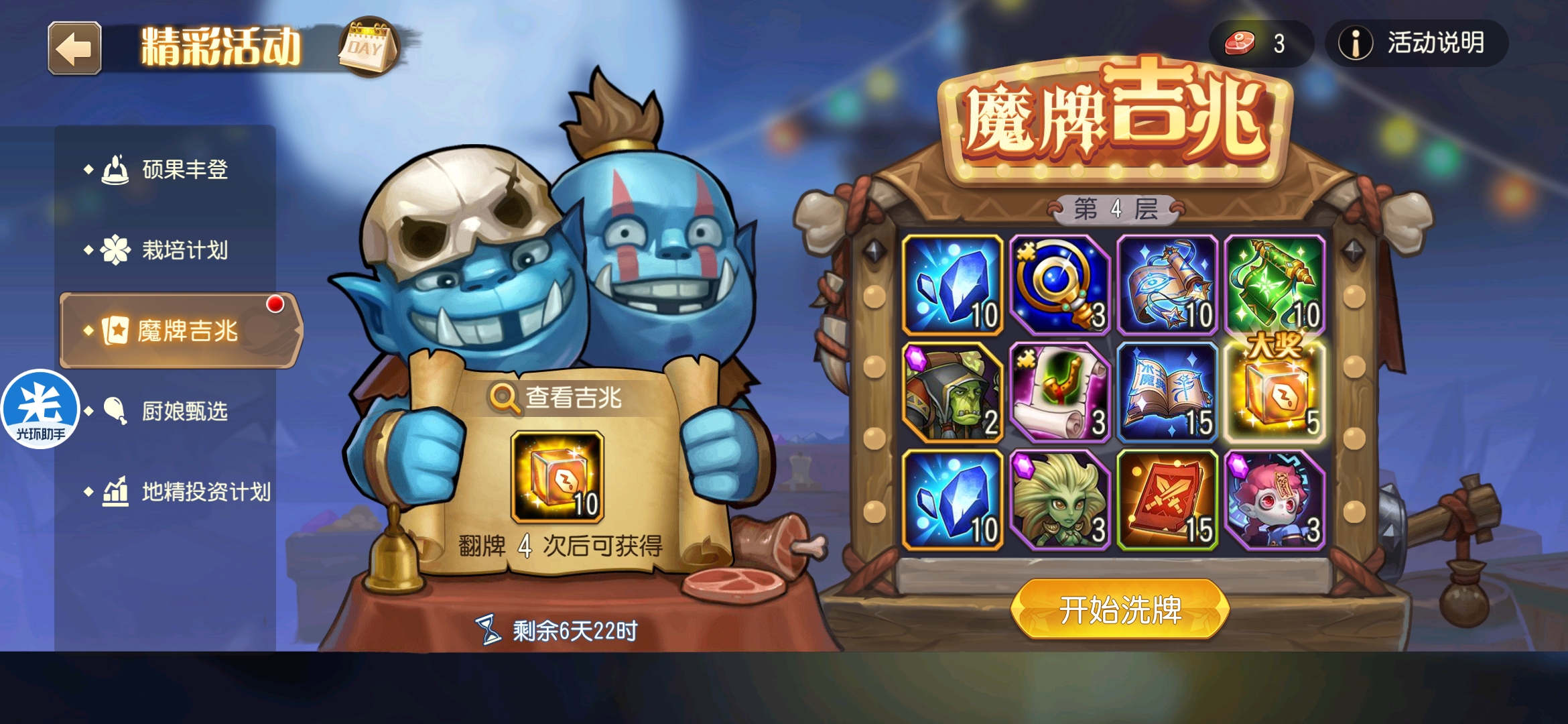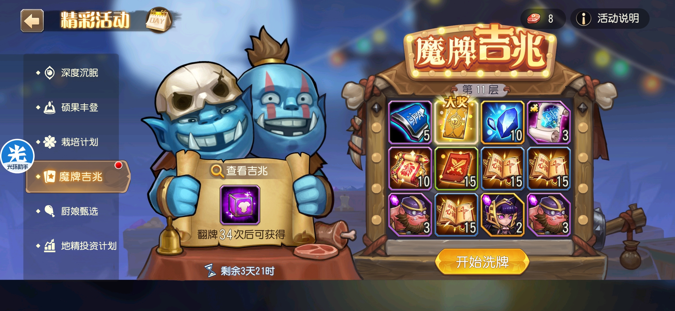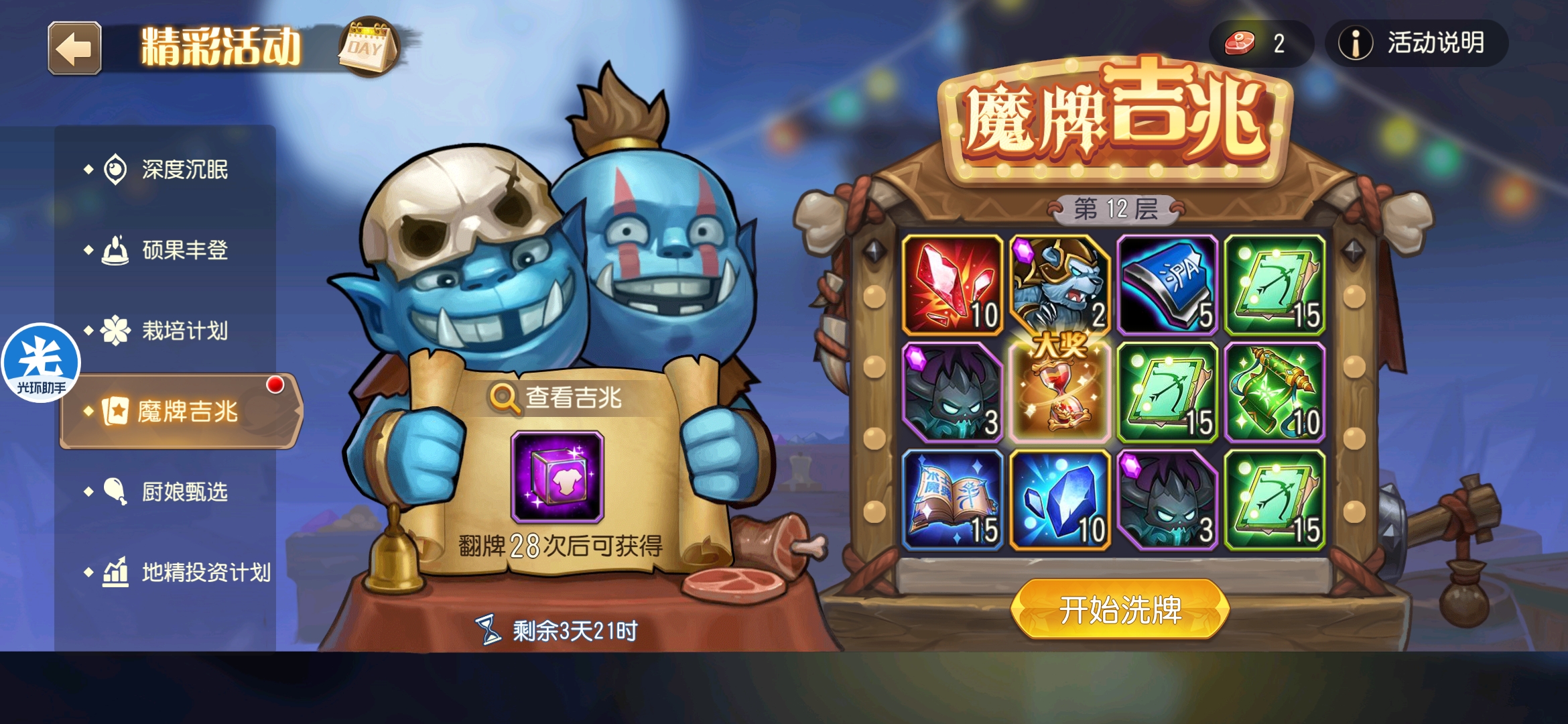 魔牌吉兆活动全奖励(20层)怠惰w发布于 2023-10-15关注每个人奖励不同,我这个只是给大家做个参考。这个活动奖励很好值得六体八体刷。这个活动大概有两个玩法。第一个是快速进入下一层,每五层奖励会更好。第二个就是像我一样拿到需要的奖励,再去下一层。(这个活动所有奖励都有概率翻倍,包括大奖) 这里大奖翻倍了,我就进入了下一层。 这里忘拿术士灵魂石了,本来想拿的。 奖励很好直接全开。 剩下是技能书,没啥用,直接下一层。 剩下两个是技能书,没啥用,直接下一层。