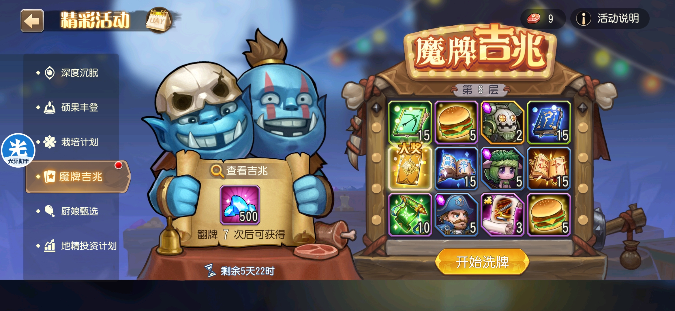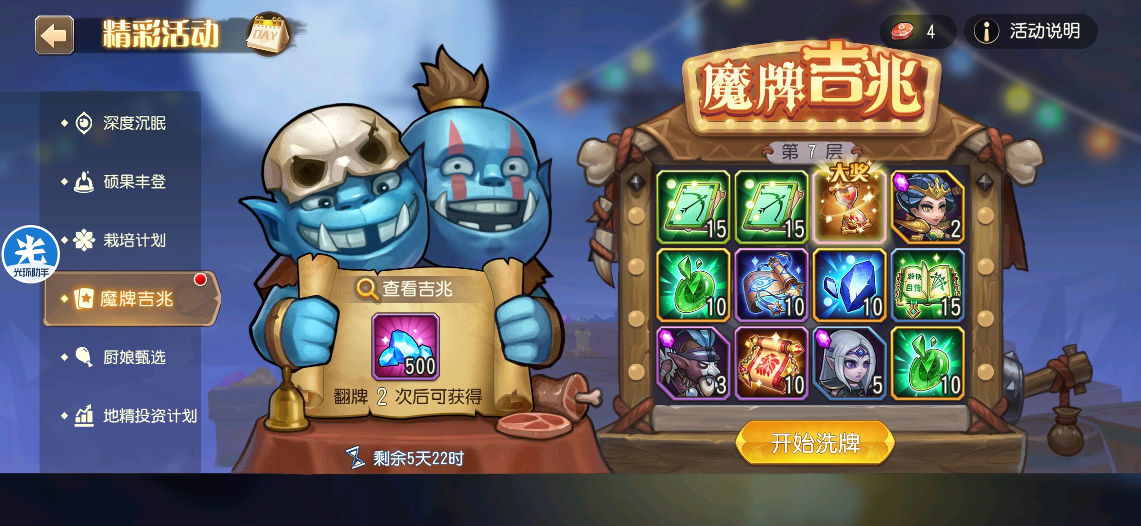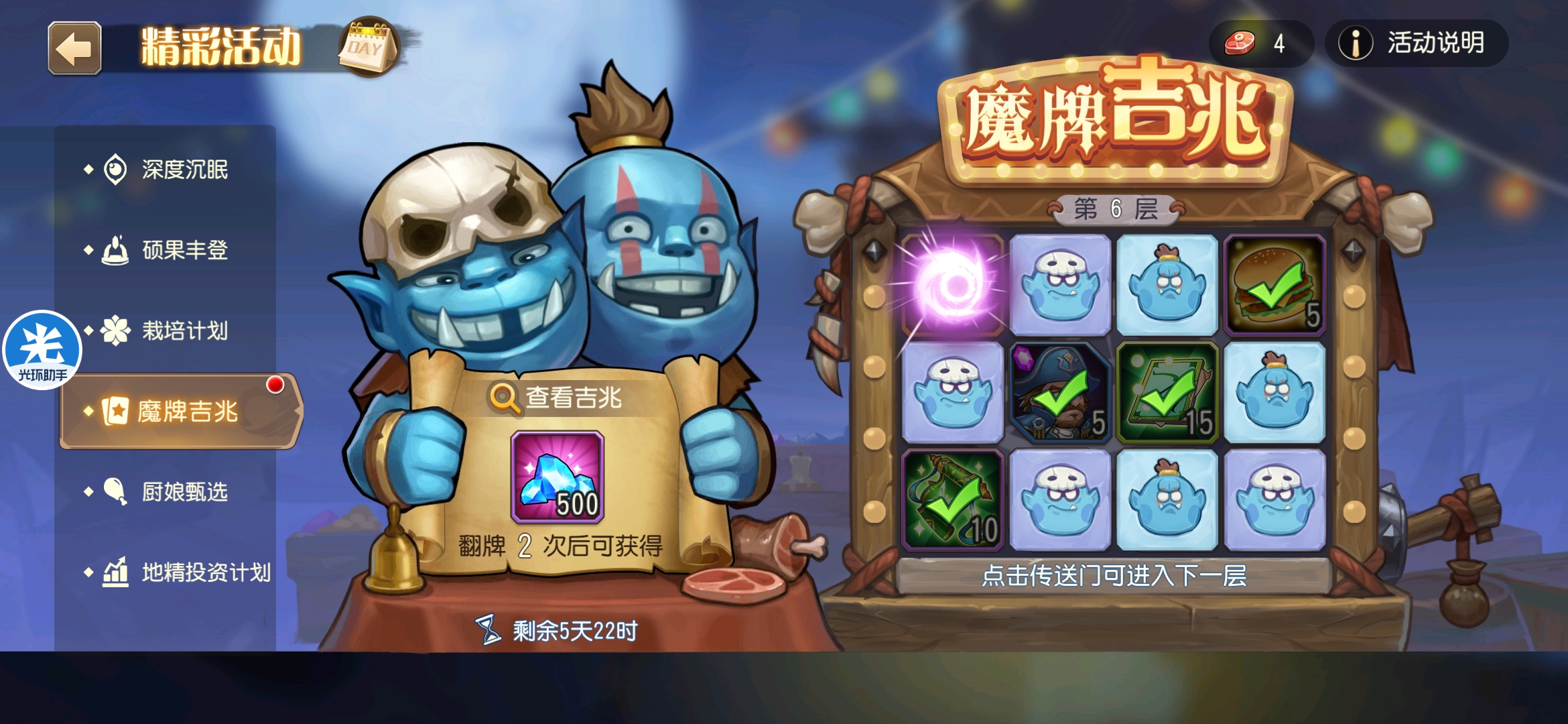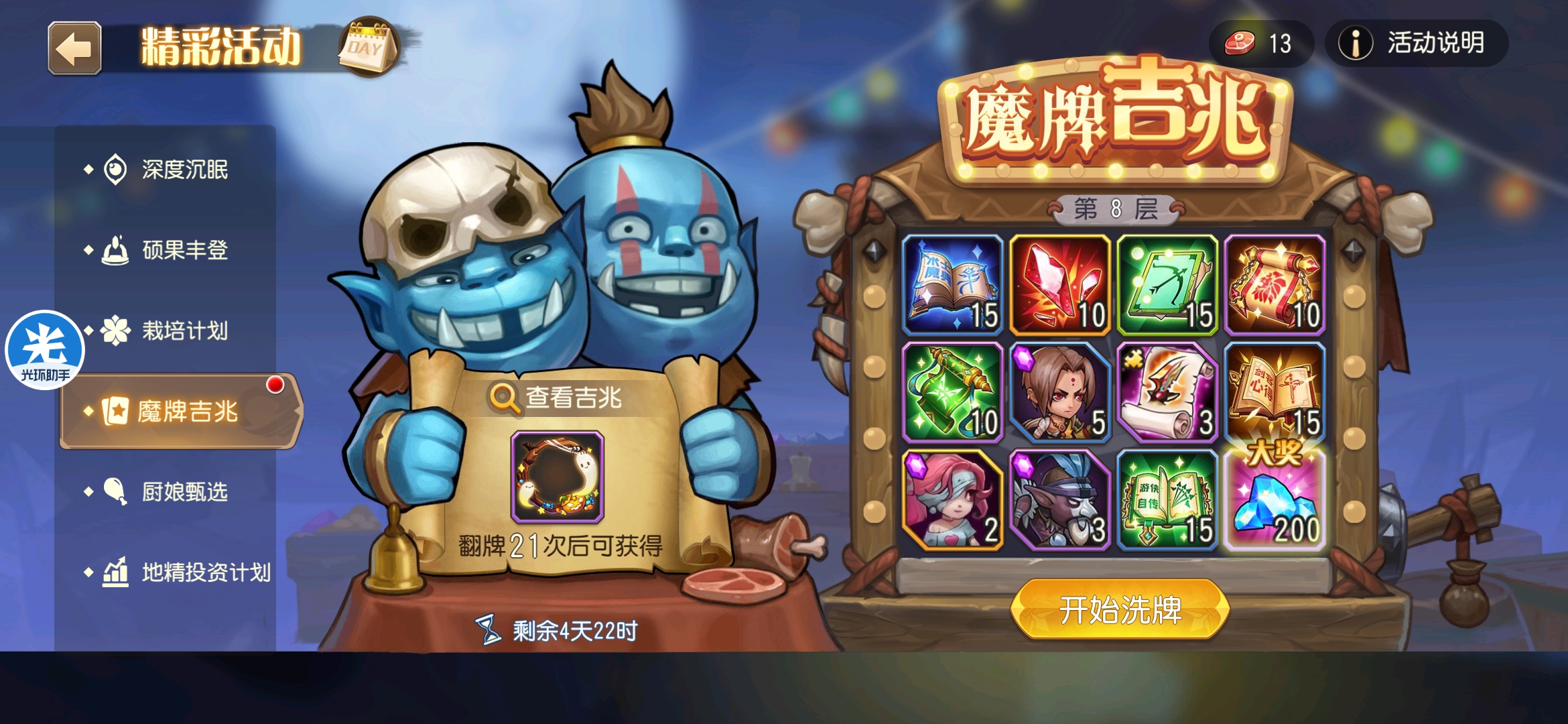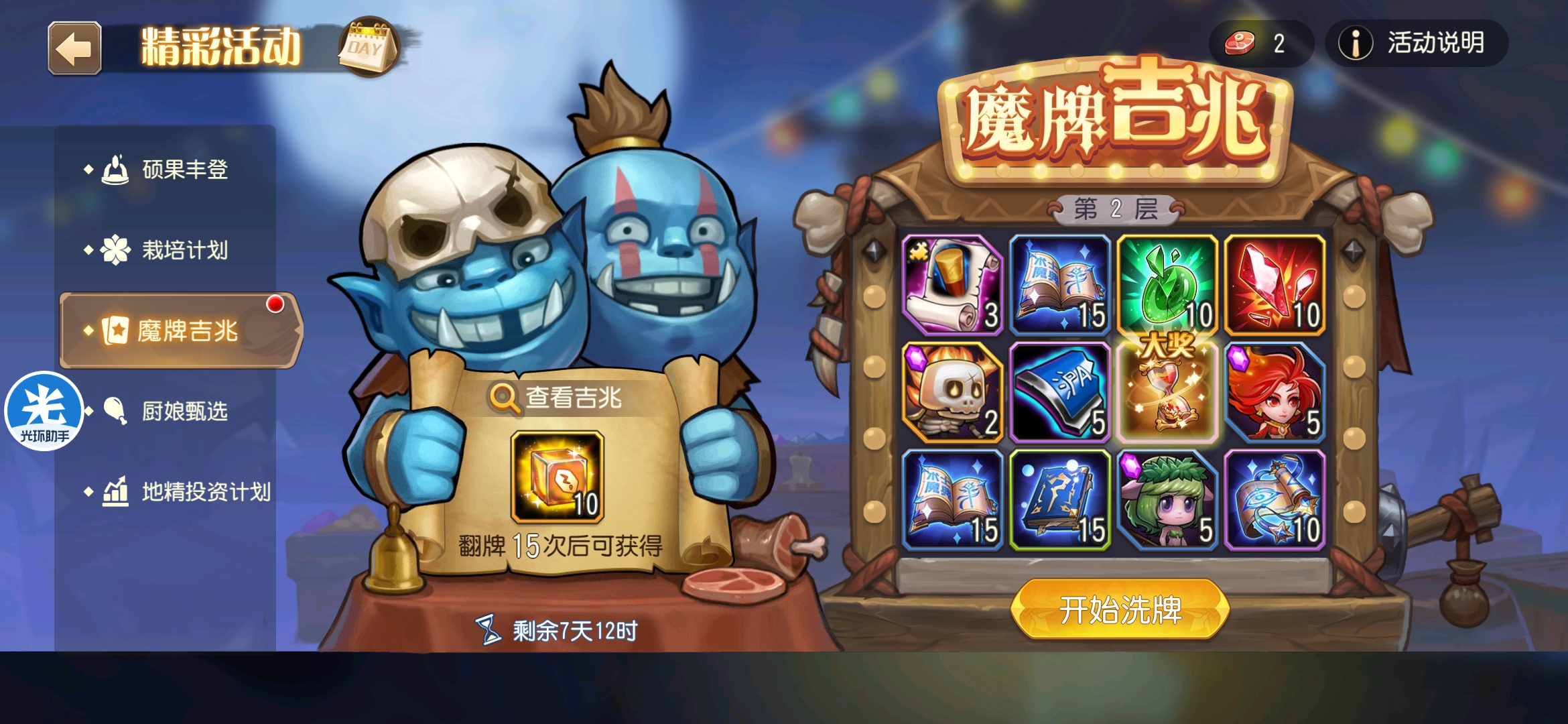 魔牌吉兆活动全奖励(20层)怠惰w发布于 2023-10-15关注每个人奖励不同,我这个只是给大家做个参考。这个活动奖励很好值得六体八体刷。这个活动大概有两个玩法。第一个是快速进入下一层,每五层奖励会更好。第二个就是像我一样拿到需要的奖励,再去下一层。(这个活动所有奖励都有概率翻倍,包括大奖) 这里大奖翻倍了,我就进入了下一层。 这里忘拿术士灵魂石了,本来想拿的。 奖励很好直接全开。 剩下是技能书,没啥用,直接下一层。 剩下两个是技能书,没啥用,直接下一层。