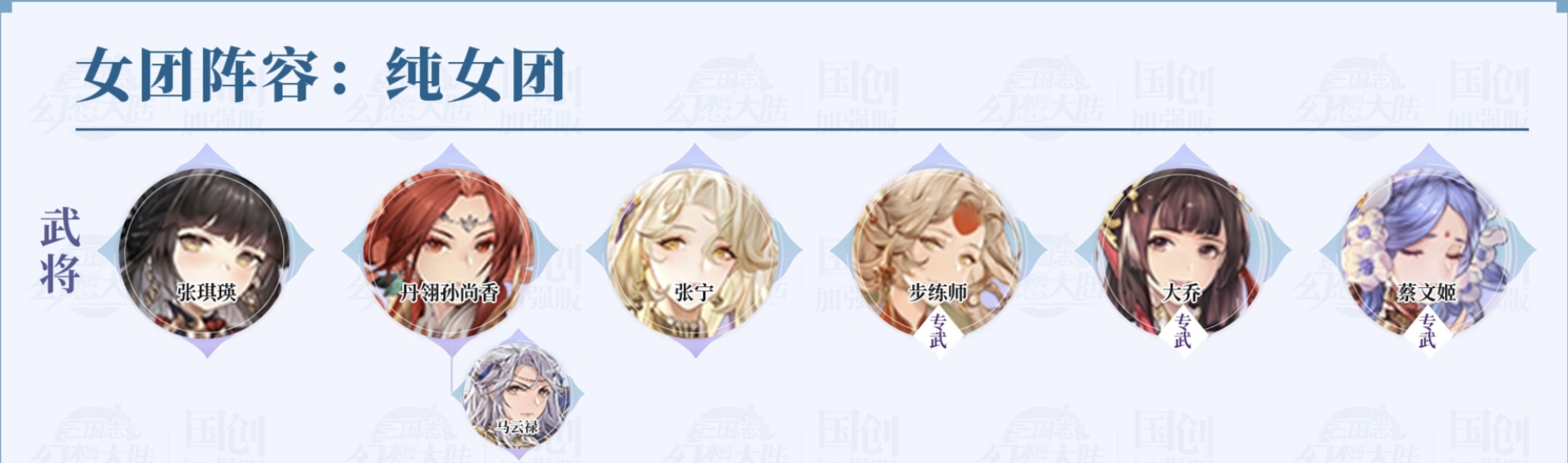 纯女团由张琪瑛,丹翎孙尚香,大乔,张宁,步练帅,大乔,蔡文姬组成。张宁、步练师,蔡文姬提供辅助类增益,其余三者主攻。前期可以拿张星彩、关银屏、邢道荣替换其中的一些卡牌进行过渡,抽卡心愿武将可以选择自己所需要的阵容中一些获取难度比较大的卡牌(其中无双蔡文姬通过新区的成长任务可以获取一只)