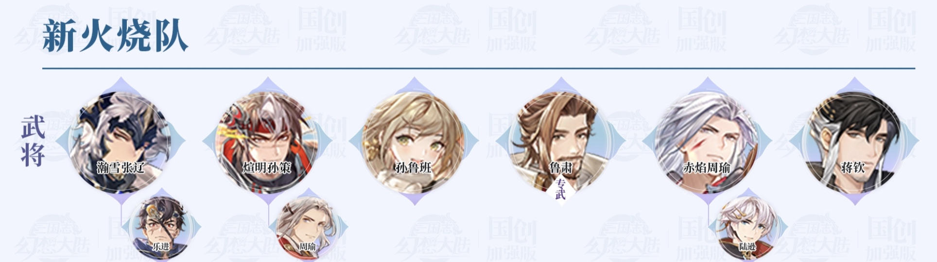 火烧阵容即主打打灼烧伤害的阵容,不过火烧比较废元宝废时间,但是养成出来之后也是非常优秀的。前期周瑜、丁奉、赤焰周瑜、凌统、徐盛、水境使劲叠灼烧就可以了,当灼烧达到一定的层数时,伤害极为可观,养成要注意提升阵容的坦度及输出能力。后期可以换成上面这套阵容瀚雪张辽,煊明孙策,孙鲁班,鲁肃,赤焰周瑜,蒋钦。