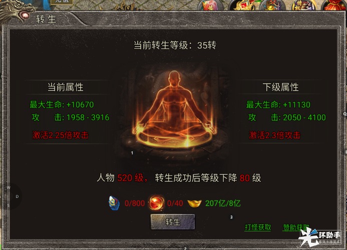 《魔狩战纪》转生养成光环小G发布于 2023-10-16关注【转生种类】1. 转生材料分为两大种类分别是:1-20转为涅槃神石、21转后为涅槃神石。【转生属性】1. 加最大生命值、攻击值,攻击倍数。【转生升级】1. 花费足够数量的转生材料、人物等级以及元宝进行升级。【获取途径】 1. 通过赞助特权、相对应地图挂机中获取转生材料。