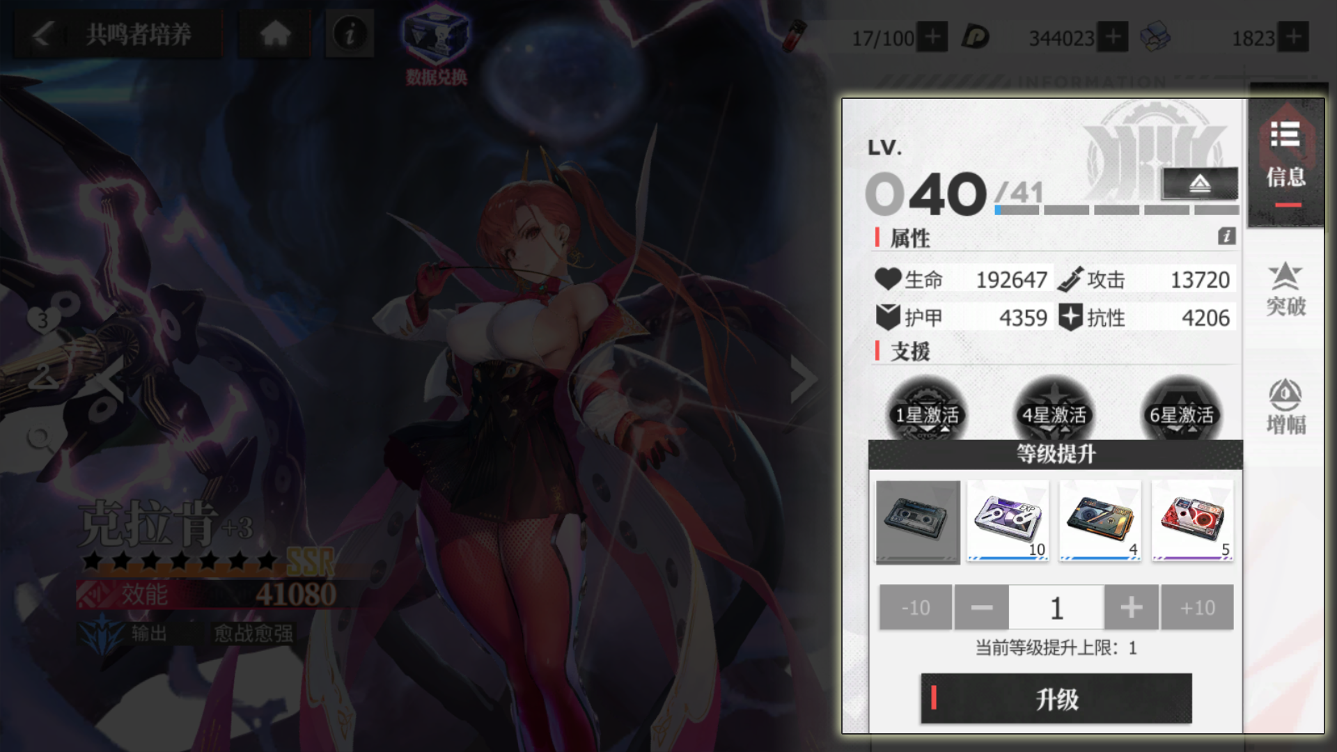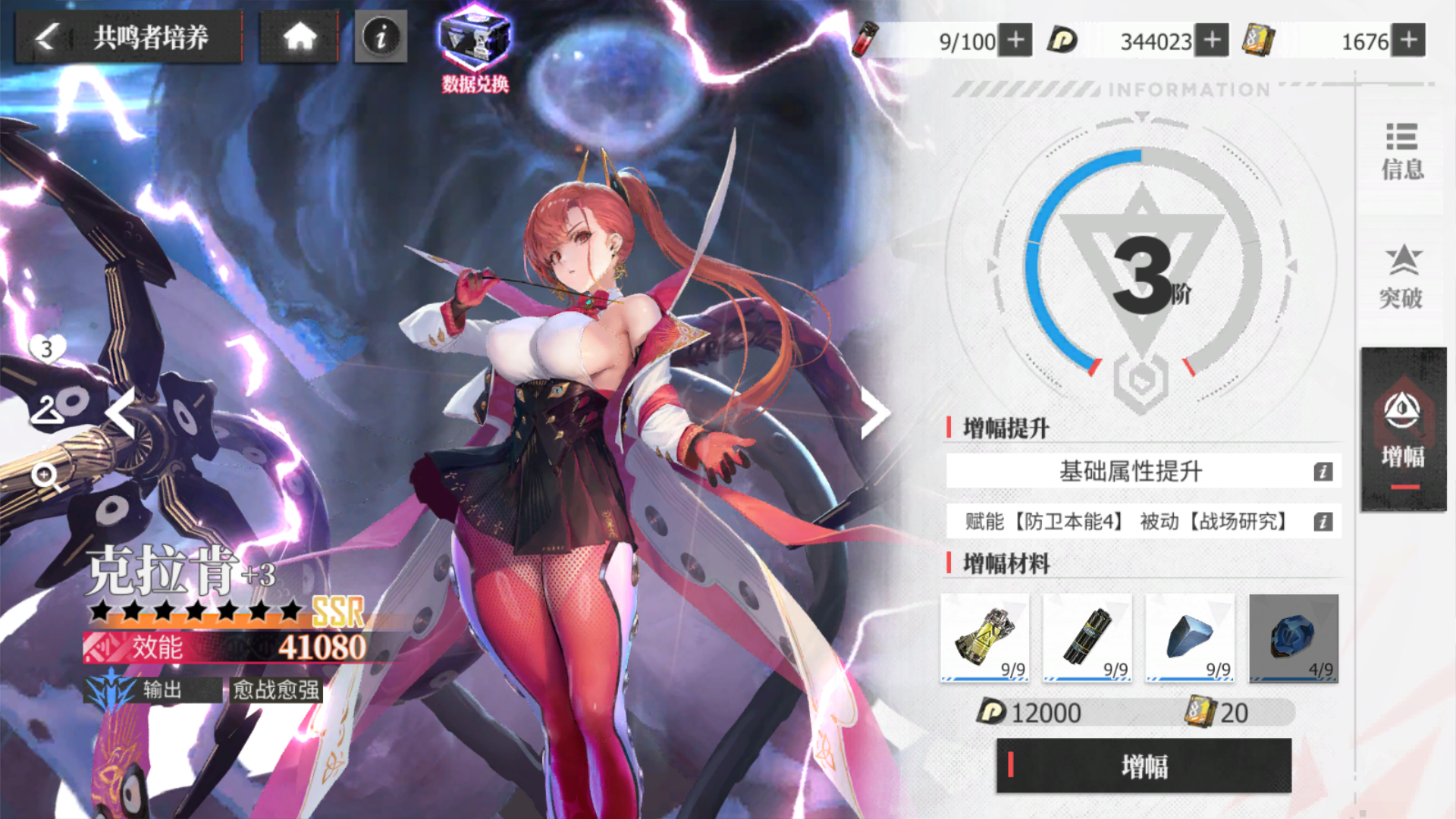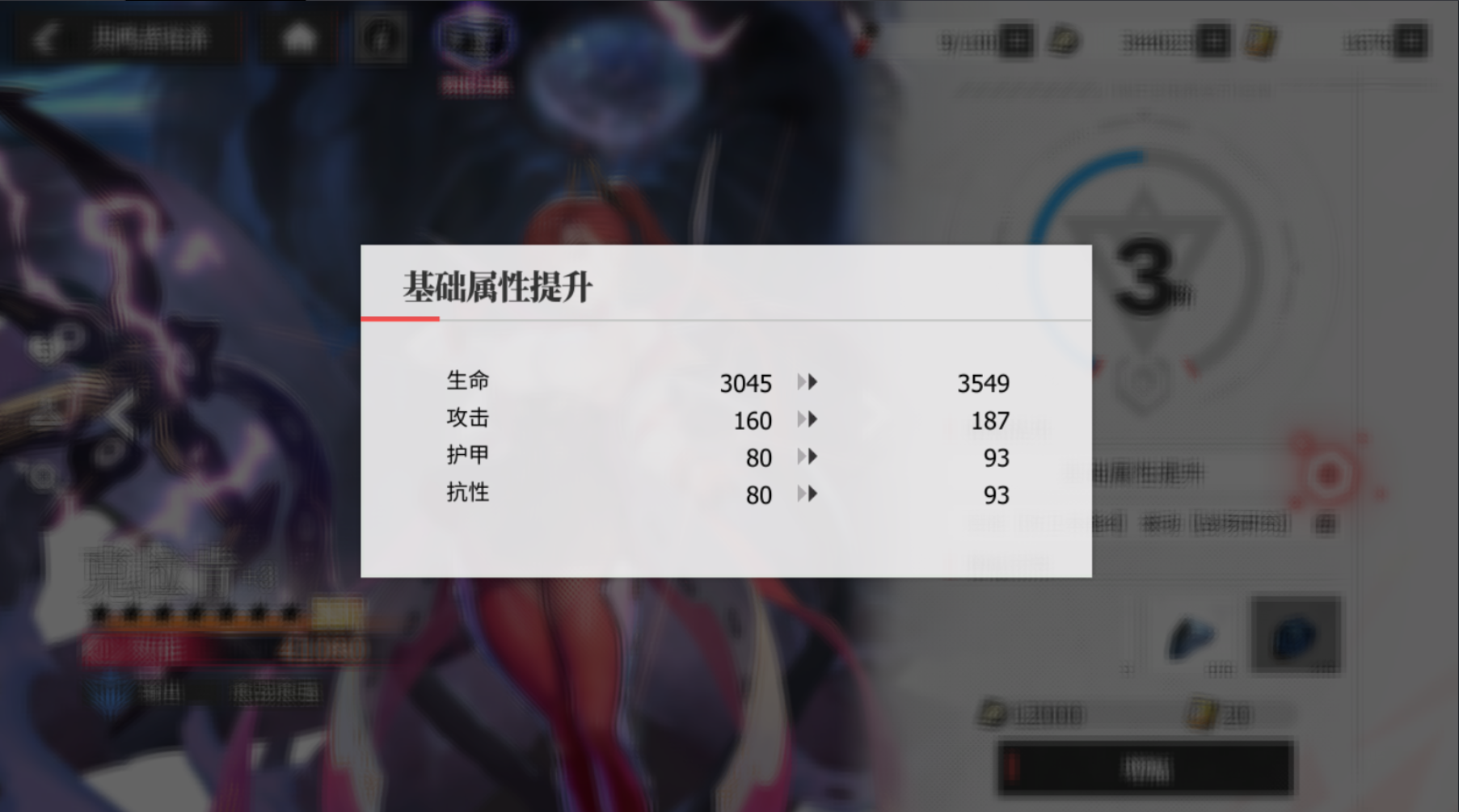 当然,在绯色里除了等级也有着阶级的存在,每次增幅都会增加当前阶级的进度条,当前阶级的进度达到100%后即可达到下一阶级,举个例子,3阶升到4阶共需要增幅四次,在第四次增幅之后即可升为四阶,获得对应阶级的技能和属性提升。