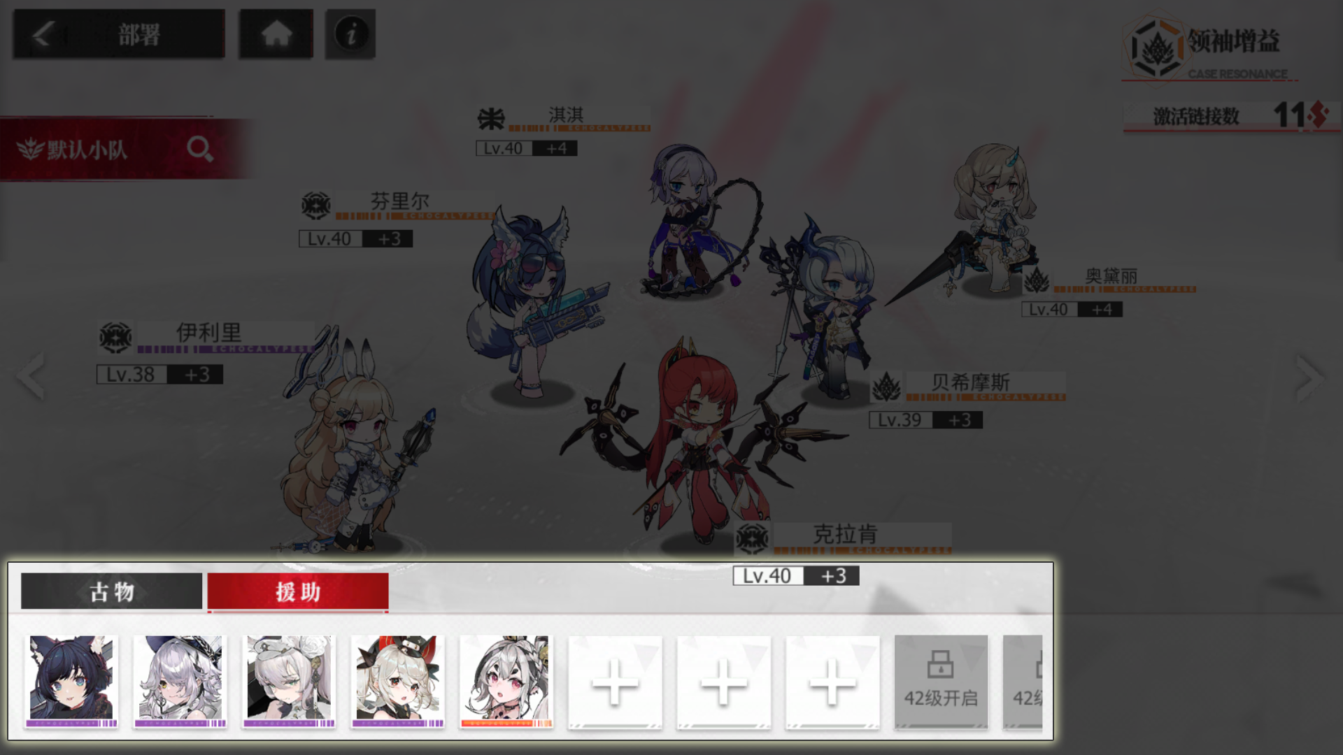 除了提升等级与阶级,不同的角色之间还有着关系链接,在同时上场的情况下会大幅提升其中一名角色的属性。不过因为上场的角色只有六名,为了链接去上场强度一般的角色并不是我们的初衷,所以我们可以选择将一些仅用来触发链接的角色放置在援助中,放在援助位的角色即使没有上场,也能触发场上角色的链接效果。