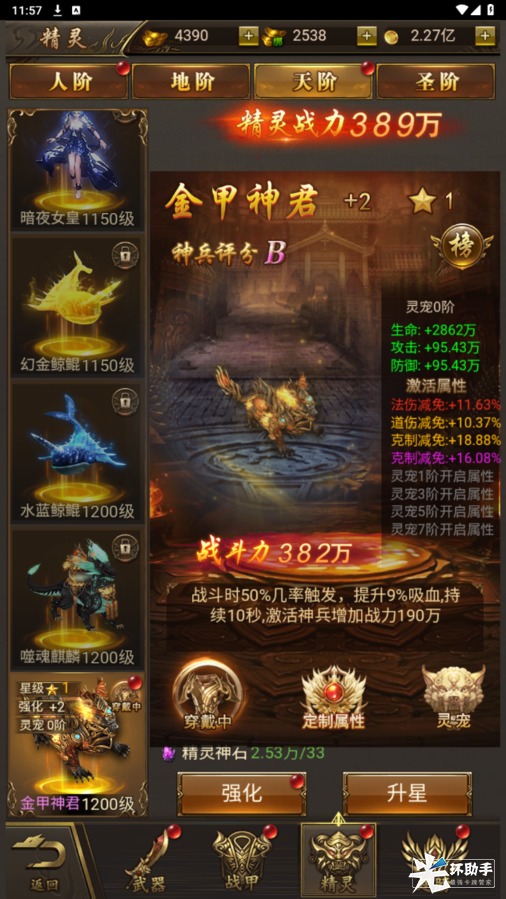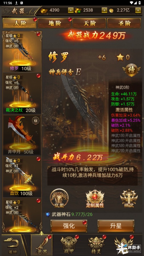 (1)强化:最基础加强神器属性的功能,每次强化都需消耗对应的神石