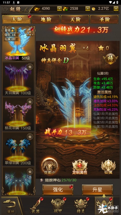 神器系统有武器、战甲、精灵和翅膀大四部分