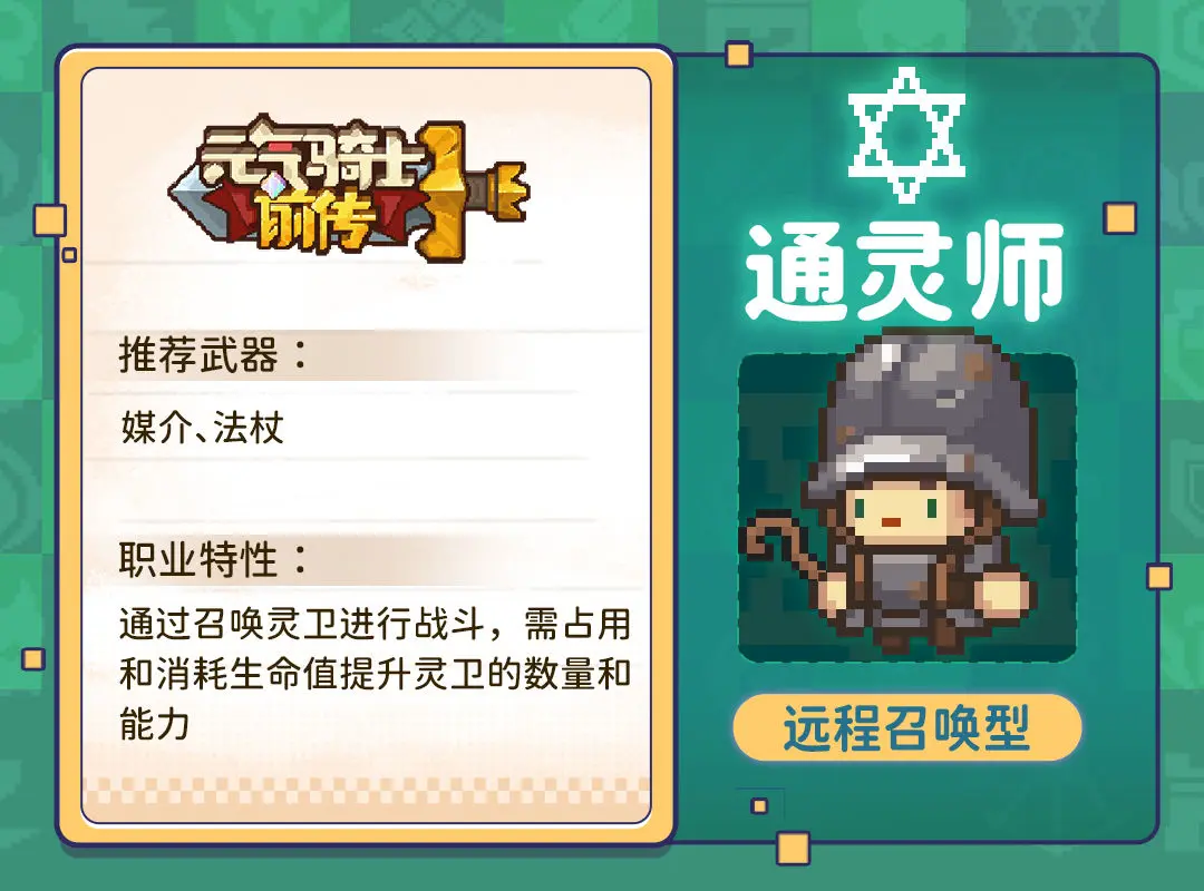 通灵师的混合职业能力不容小视,和守卫职业组成坚不可摧的灵魂守卫,他能统领大军向前踏进,用信任与爱心跟灵卫一起冲锋陷阵。与盗贼职业组成诡计多端的忍者,行动变幻莫测,分身真假难辨,操作幻象单人成军。和火焰术士组成浴火重生的烈焰法师,孵化喽啰扰乱敌人,所到之处化为焦土,犹如炼狱一般。