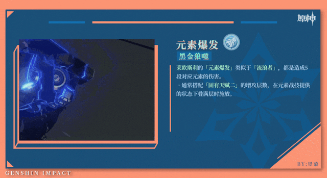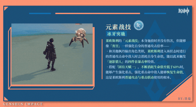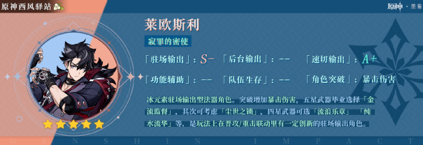 冰元素驻场输出型法器角色。设计思路上与「流浪者」类似,通过「元素战技」强化自身普通攻击进行输出,但输出手法上有一些不同,莱欧斯利主要搭配「固有天赋一」的强化重击,进行普重连携输出,最后「元素爆发」收尾倒是有些类似。
