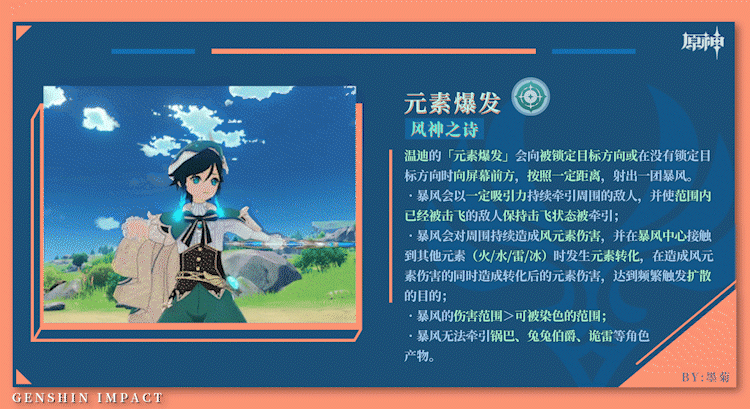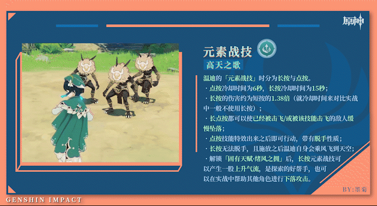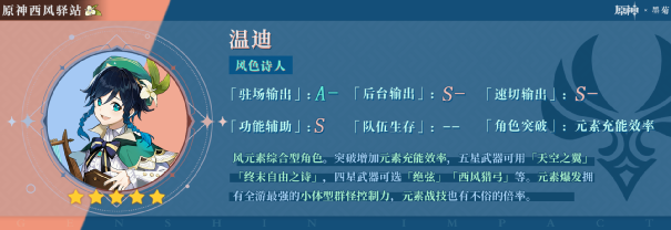 风元素综合型弓系角色。温迪的聚怪功能性有目共睹,但目前深渊也有许多聚不起/聚不动的敌人,因此慢慢为大家所诟病,登场率也有一些下降,不过他面对轻重量的敌人时还是有很强的压制力。整体玩法距离上次up并没有太大改变,因此可以参考上次up时的描述。