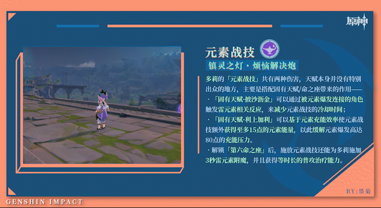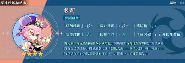 雷元素治疗辅助向双手剑角色。多莉主要利用「元素爆发」来为队友提供治疗,虽然元素爆发所需能量高达80点,但有着「固有天赋·利上加利」在,多莉每次施放「元素战技」,都能基于“元素充能效率”为自身额外恢复最高达15点的元素能量,搭配其他充能向武器使用时,对她来说充满能量并不困难。