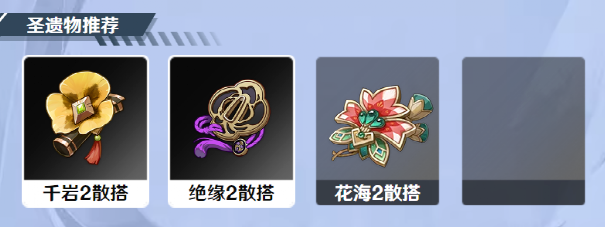 在圣遗物上,多莉没有合适的四件套选择,一般选择「千岩/花海」二件套+「绝缘」二件套的散搭组合,如果队伍中有主打草元素输出角色,可以考虑让多莉佩戴「深林的记忆」四件套来辅助。