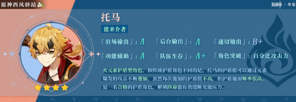 ※ 「 强度指标:战场/后台/速切 输出能力」:站场输出dps未考虑后台技能、后台输出dps不考虑前台角色、速切输出dps带入冷却时间计算,装备选择及词缀模组均取当前版本下最高配置,五星角色以0命为准、四星角色以满命为准,武器同理,单体输出评价降低半级