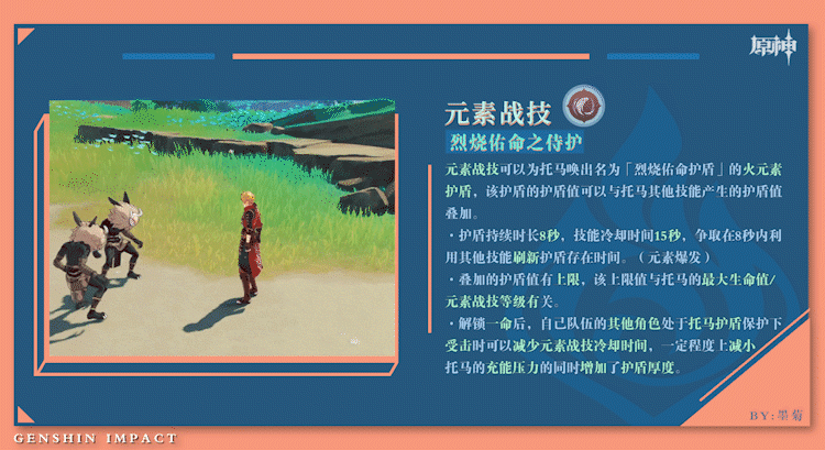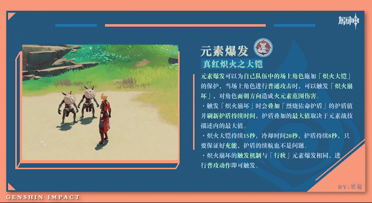 火元素综合型长柄武器角色。利用「元素战技」和「元素爆发」不断刷新护盾持续时间,堆叠护盾量来保护队友。元素爆发的触发机制上与「夜兰」「行秋」相同,均为普通攻击的协同攻击,所以一般用来保护主打普通攻击的输出角色。
