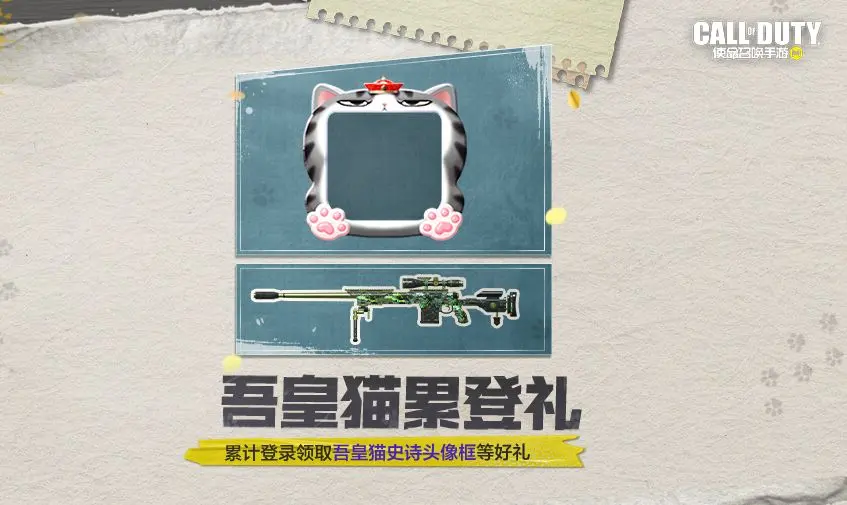 吾皇猫联动还未结束,精彩继续哦~10月21日,吾皇猫登录礼活动上线,参与活动,累计登录,即可获得联动奖励头像框-吾皇猫和稀有级武器:DLQ33-低沉怒吼等丰富奖励,这次要把握机会哦~
