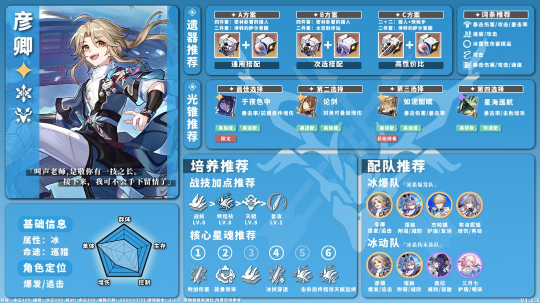 5星角色「彦卿(巡猎•冰)」现版本冰系大C,高双暴保证了下限,冰属性限制了上限